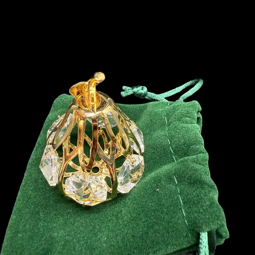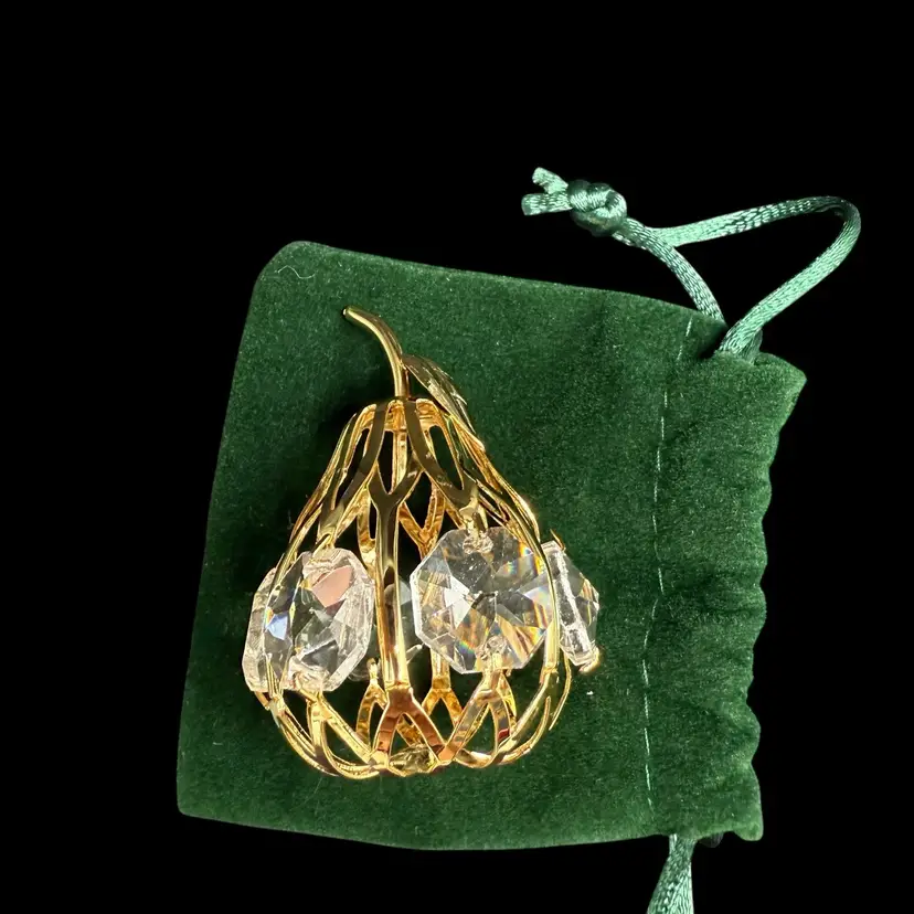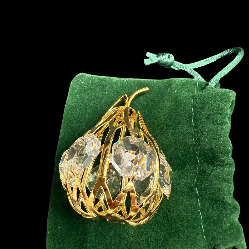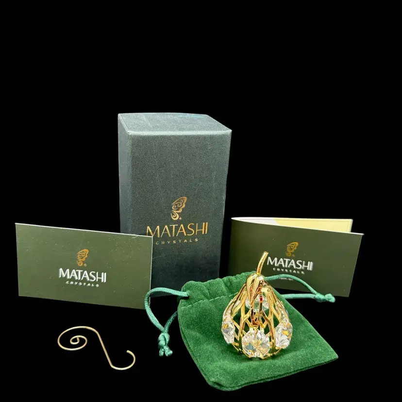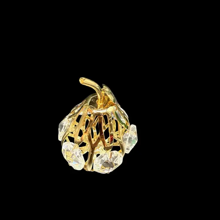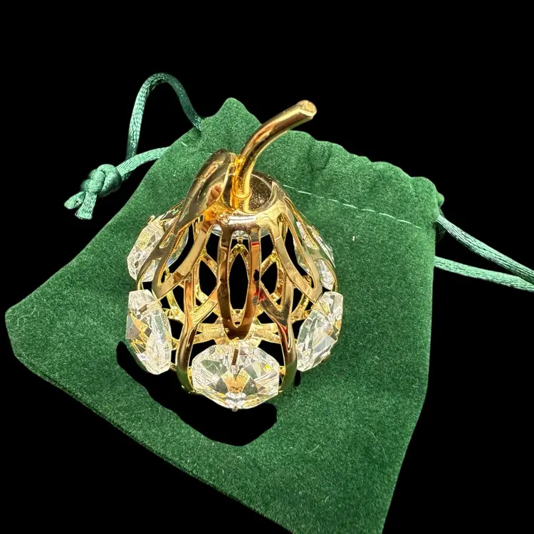 The Matashi 24K Gold Plated Crystal Studded Mini Pear Fruit Ornament is a beautifully crafted decorative piece perfect for all occasions. Made with high-quality materials including 24kt gold plating, metal, and crystal, this ornament features a charming pear shape design in a luxurious gold color. Packaged in a box, this collectible item is a part of the ornaments collection by Matashi, adding a touch of elegance to any holiday or seasonal decor. Made in the United States, this ornament is a perfect addition to any fruit-themed or ornate collection.