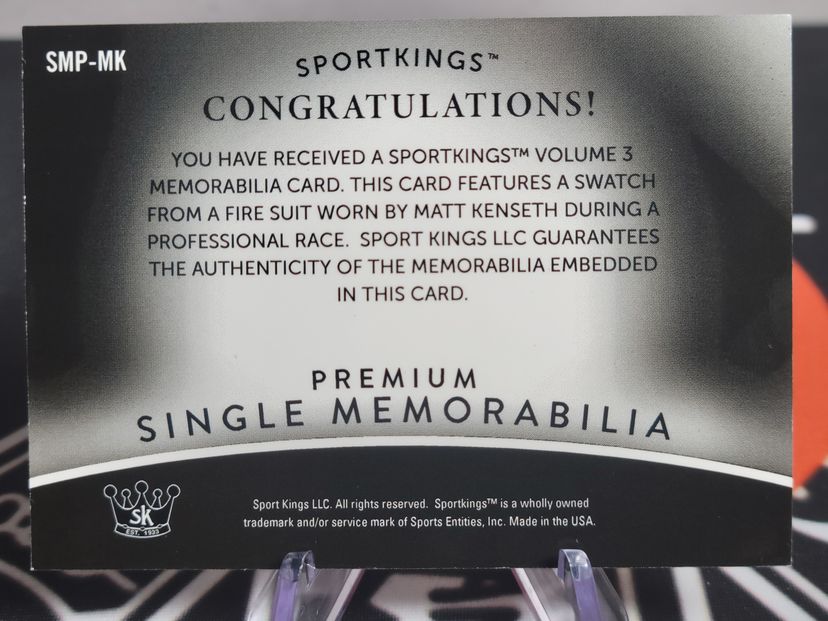 2022 Sportkings Volume 3 Matt Kenseth Legends Memorabilia card, card #SMP-MK, featuring a race-used memorabilia relic from the NASCAR champion and Hall of Famer. A premium Legends subset card celebrating Kenseth’s historic career, ideal for NASCAR collectors or memorabilia-focused collections.