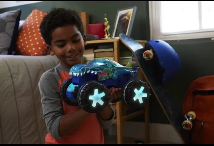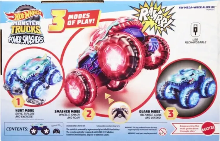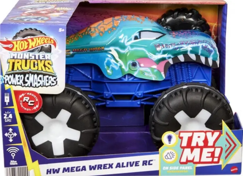 The Hot Wheels Monster Trucks beast Mega-Wrex comes alive in an oversized remote-control vehicle with interactive lights and sounds.