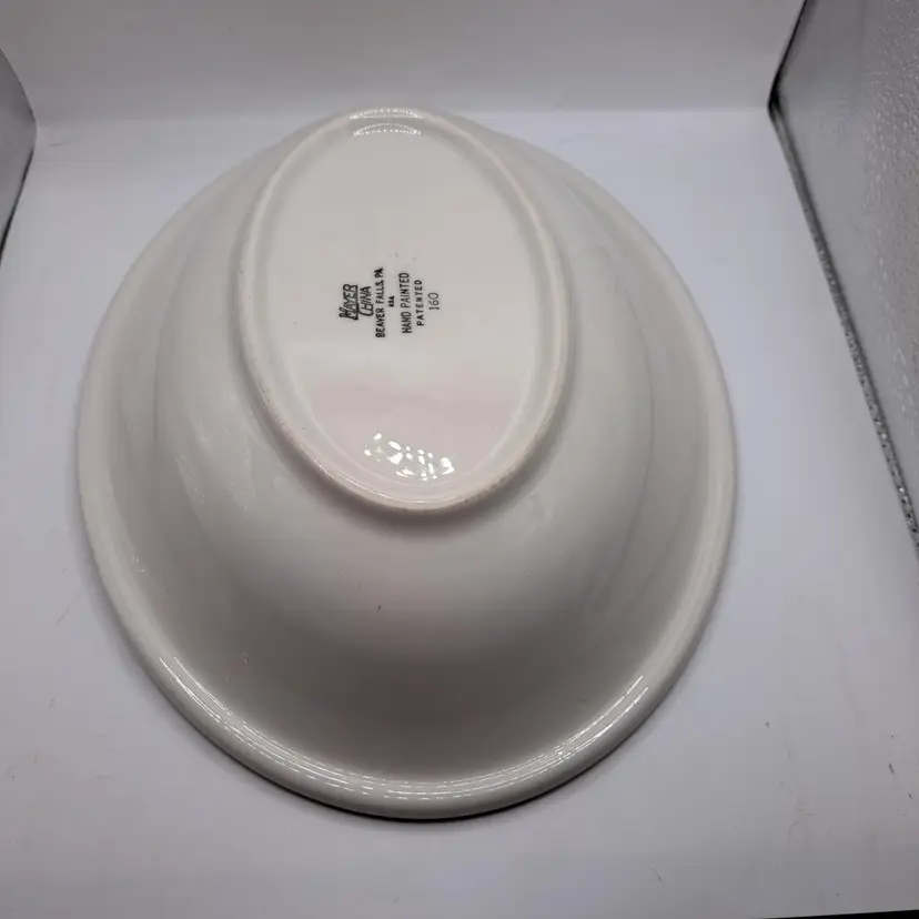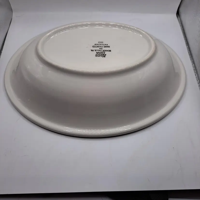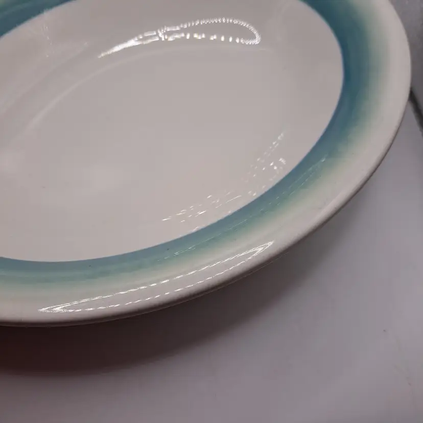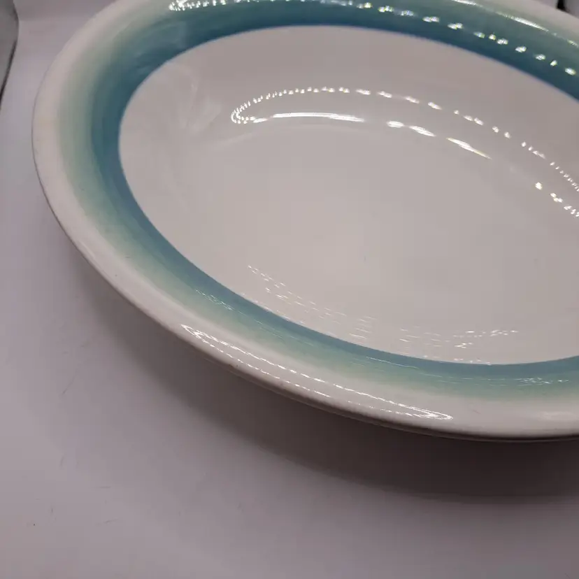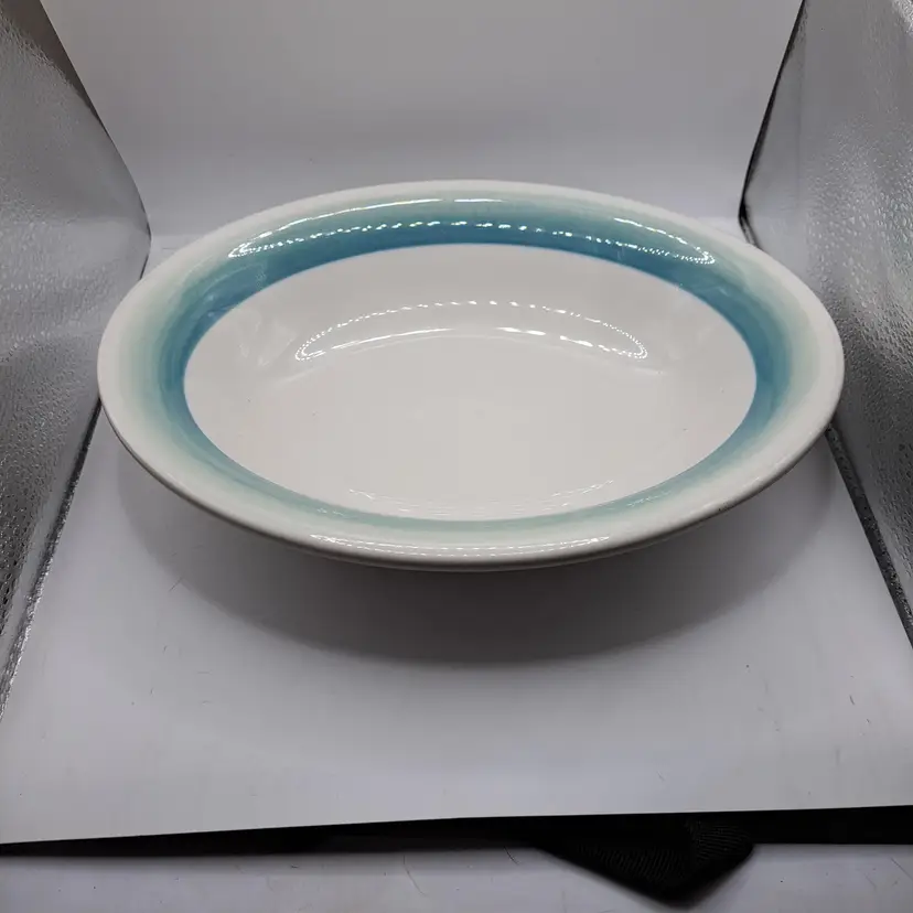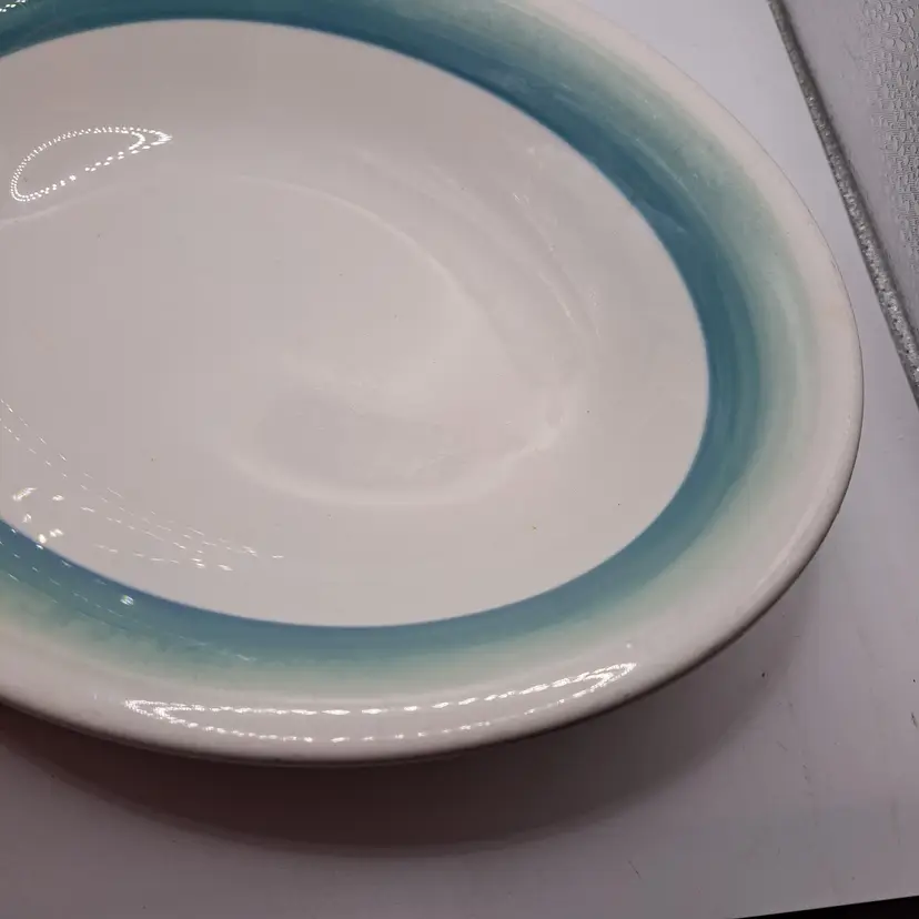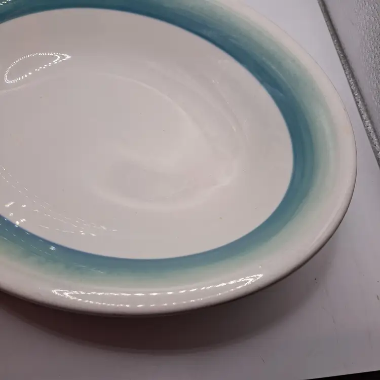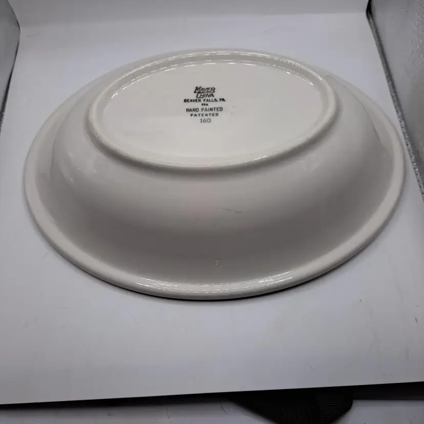 Mayer China made in Beaver Falls Pennsylvania Oval Bowl with no chips or cracks, minimal utensil marks. Aqua green blue hand painted airbrushed rim. Approximately 10.5" long, 8" wide, 2.5" deep
