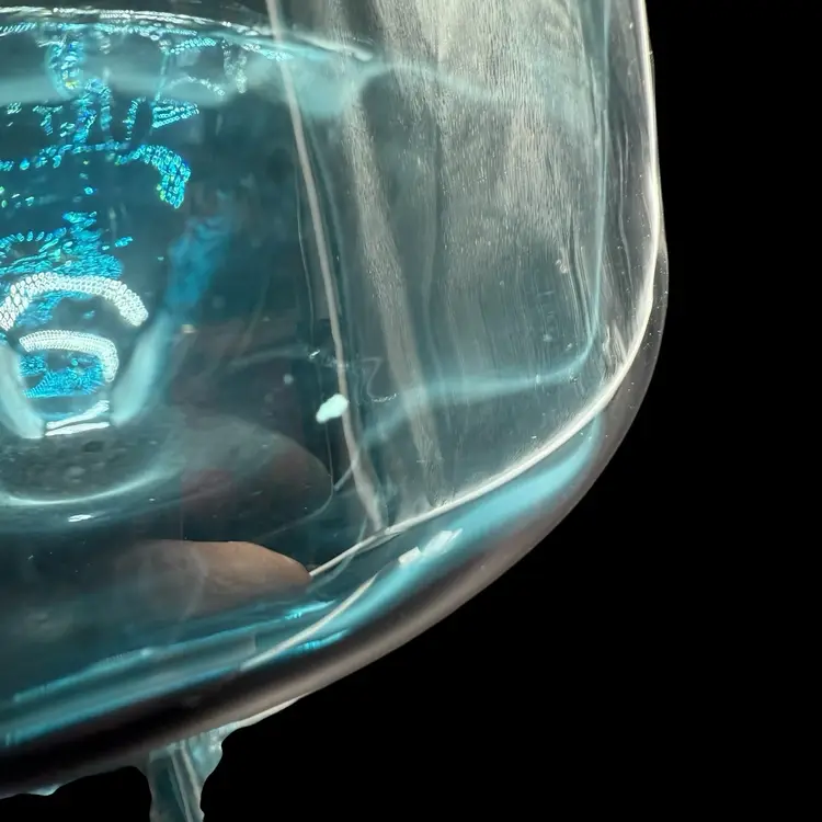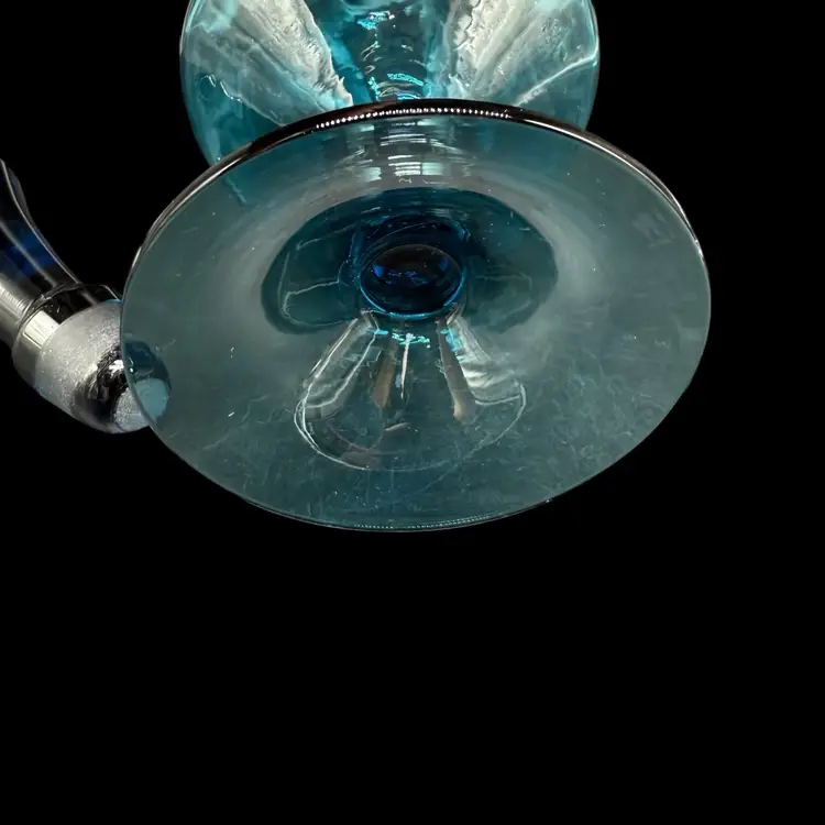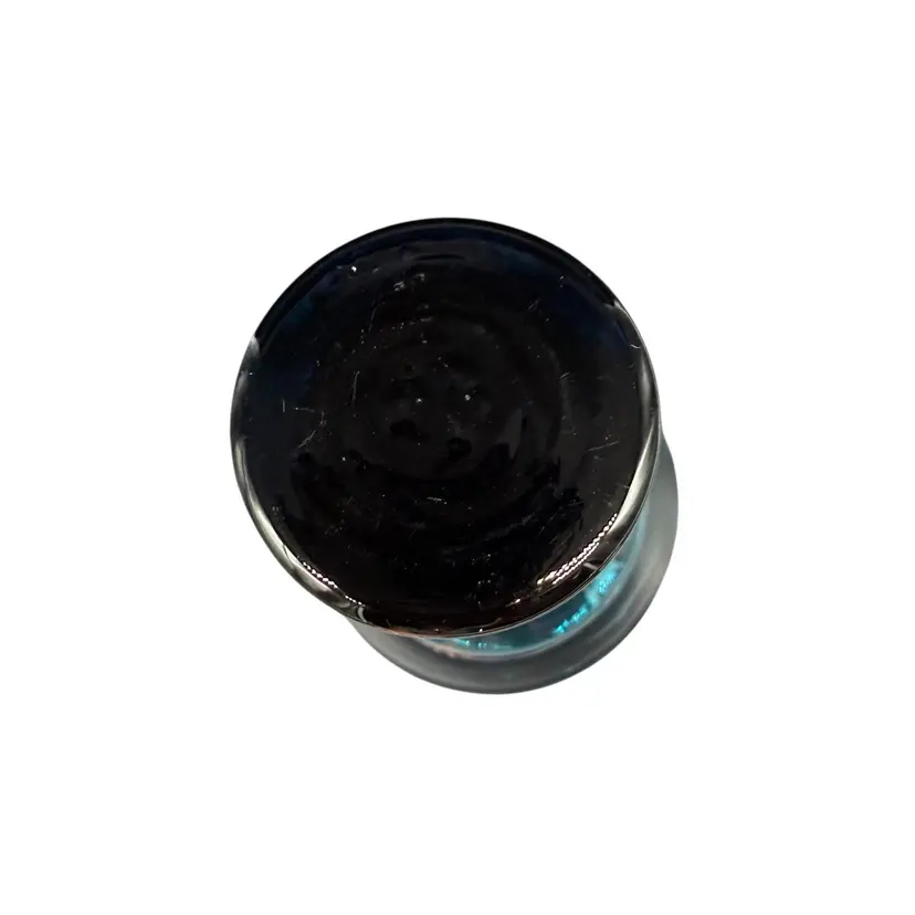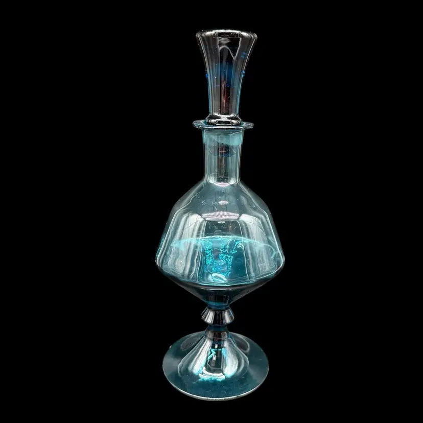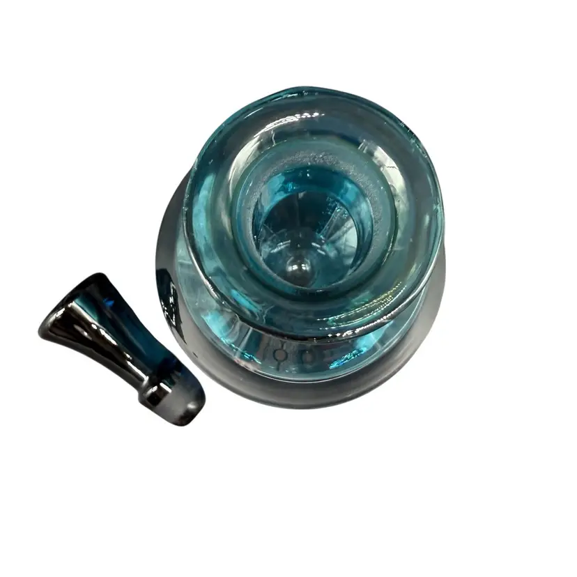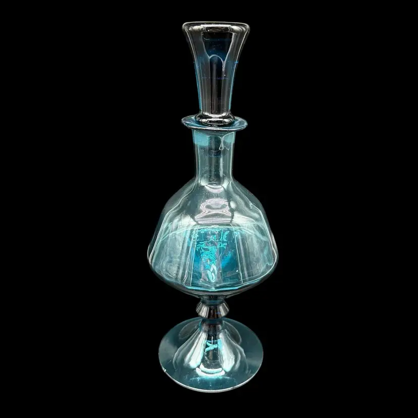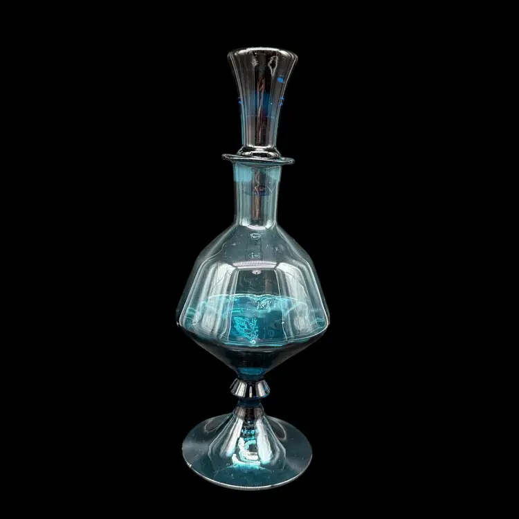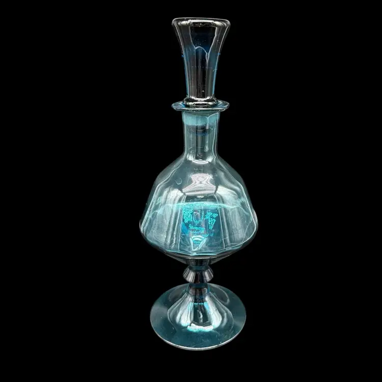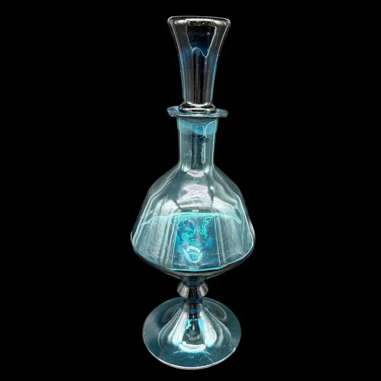 The MCM Art Glass Smokey Blue Decanter with Stopper is a vintage piece from the mid 20th century featuring a geometric shape and a glossy finish. Handcrafted in 1960, this original decanter is made of hand-blown glass in a solid smoke blue color, embodying the Mid-Century Modern style. The unique design, with a stopper, adds an artistic touch to any collection of drinkware and barware, making it a standout piece for collectors of vintage glass.