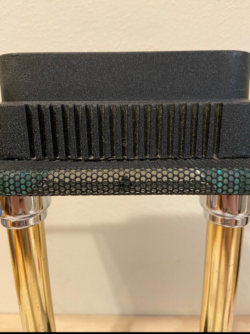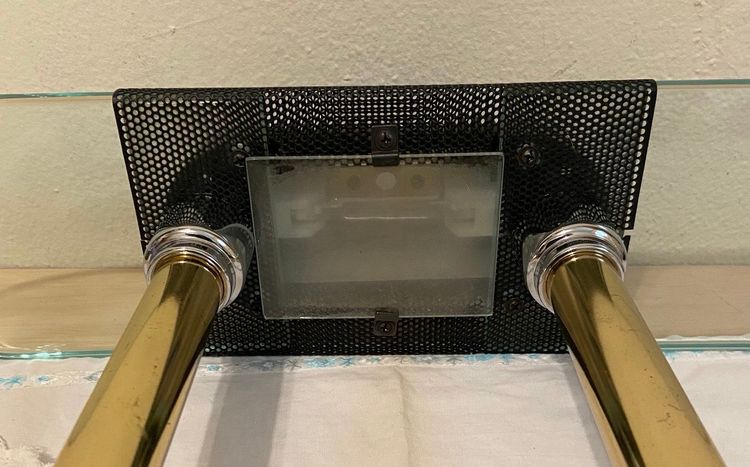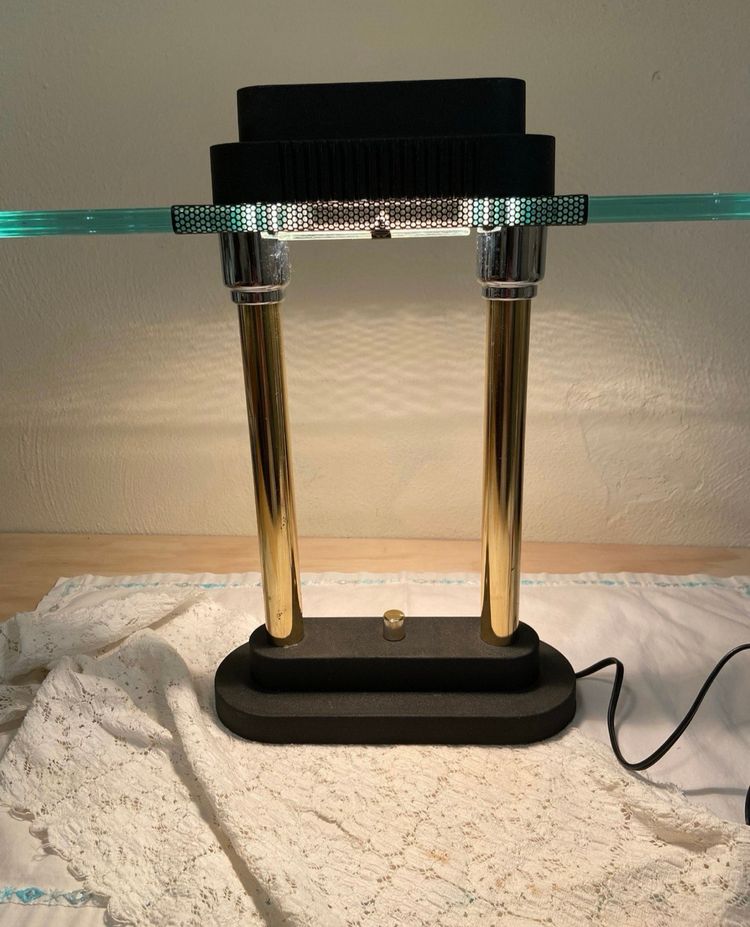 Black, brass and glass make up this unique piece.