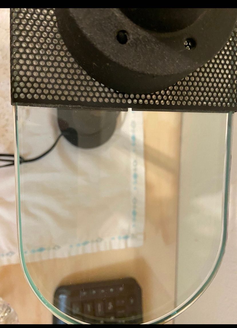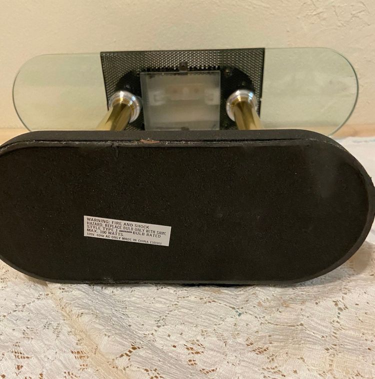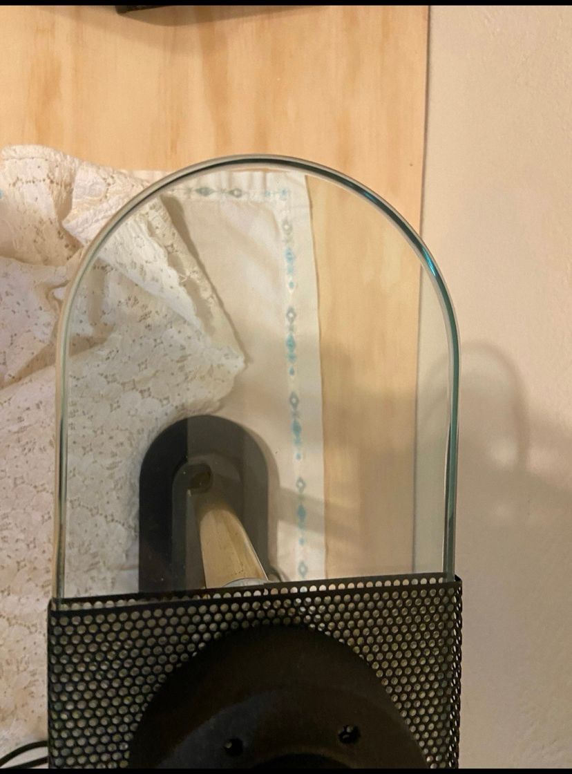 Measures approximately 15” high X 19”across and approximately 4.5” from front to back of glass. Uses halogen bulbs. Works great!