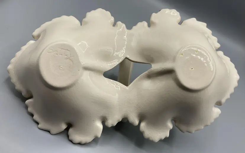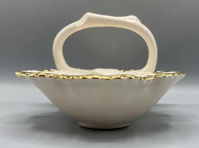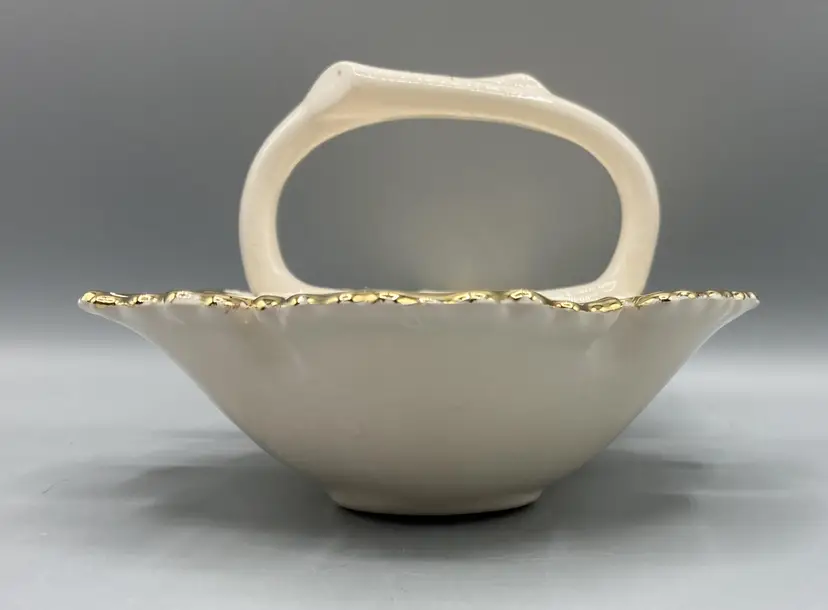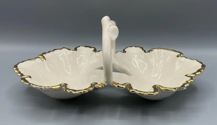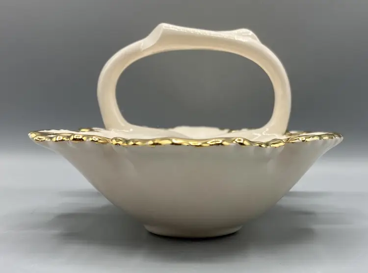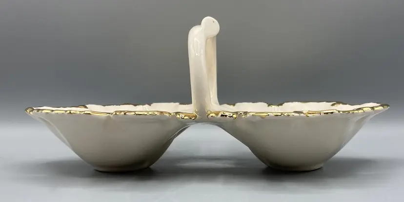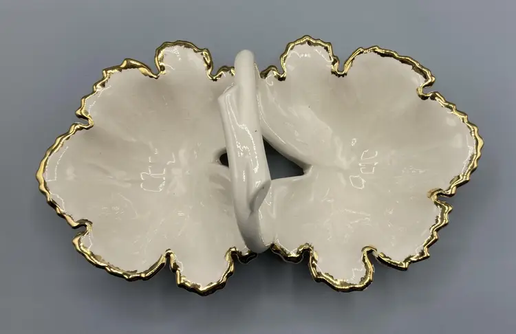 This dish is in good condition. There are a few minor chips and there is crazing throughout. The gold trim also has some minor paint loss. Please see pictures for specific details. I see identical molds labeled as Holland, but I can't be sure this is the same. Signed "Betty" on the bottom of the dish. This dish measures approximately 9 3/4" long, 5 3/4" wide, and 4" tall.