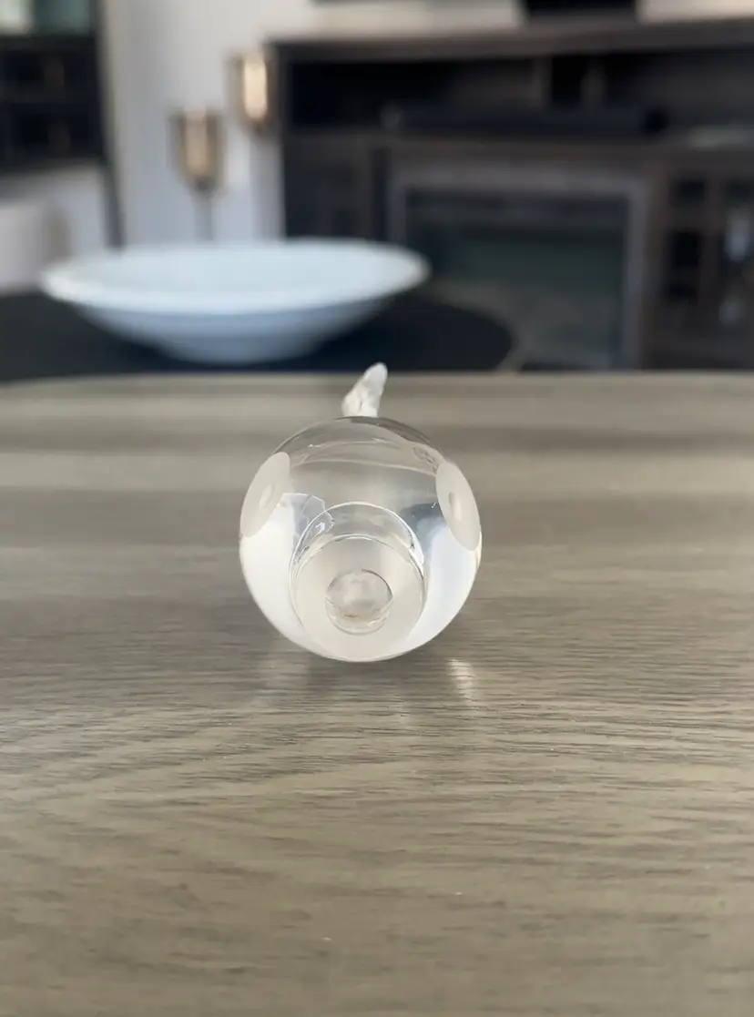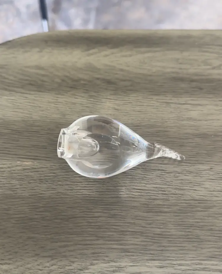 The MCM Hadeland Glassverk Norway Hand Blown Glass Fish is a vintage collectible figurine made of clear glass with a glossy finish. Handmade by the renowned brand Hadeland, this art glass piece showcases a Scandinavian design theme with a production technique of hand-blown glass. The fish measures 3.5”W and 1.5” H