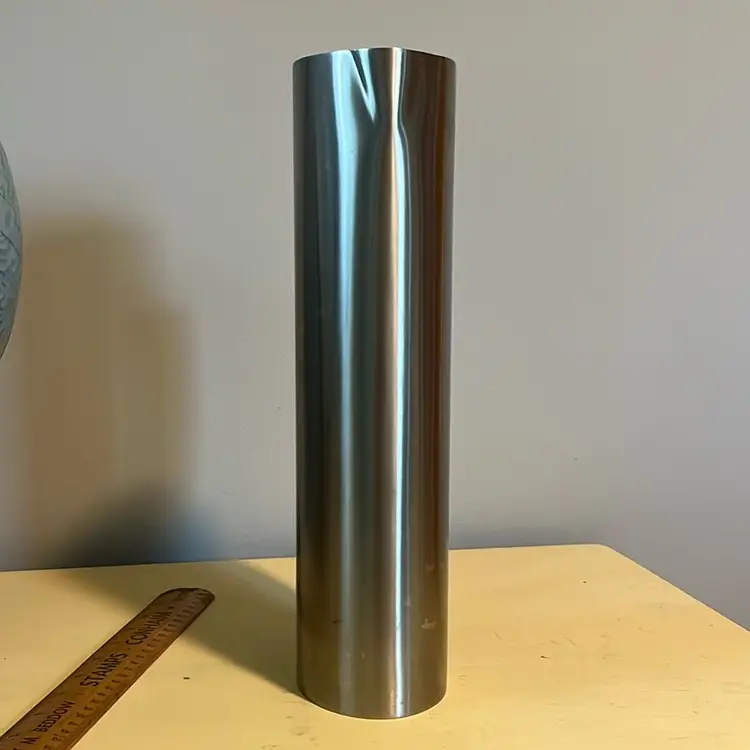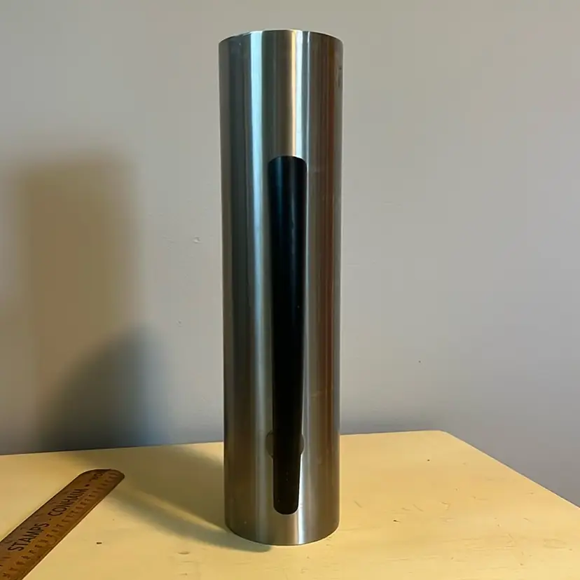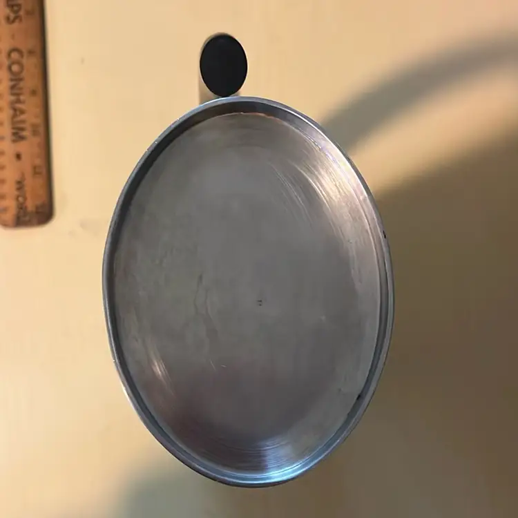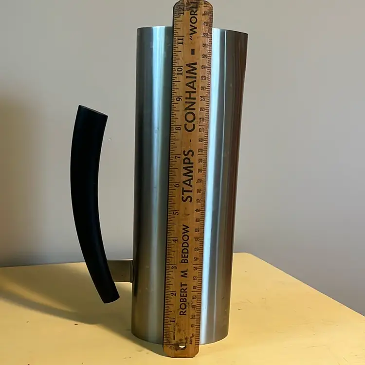 Holds 64 oz to rim, stainless with black handle. 11” tall