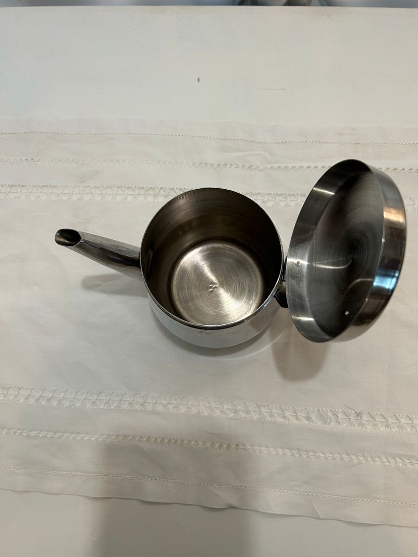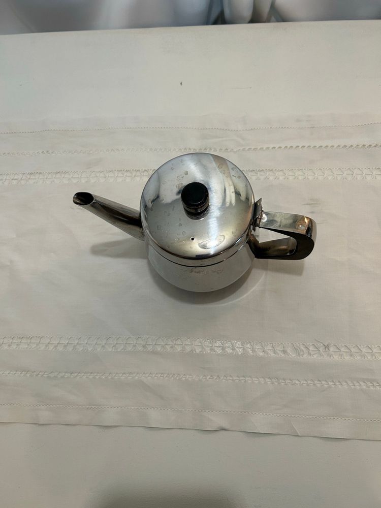 Elegant MCM stainless steel teapot with a sleek black handle, perfect for any kitchen. Use as a teapot or vase.