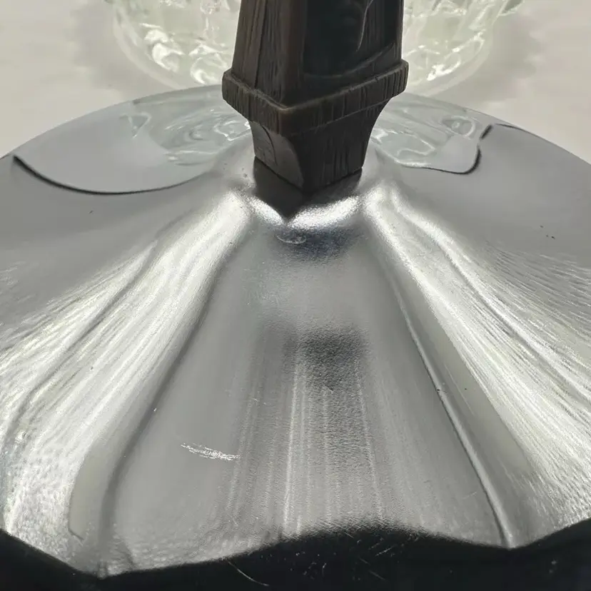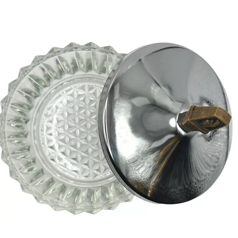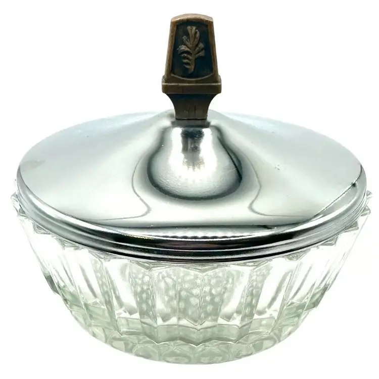 Mid Century Modern covered candy dish or trinket dish, with clear glass bowl, silver metal lid with resin finial handle, made to resemble wood. Perfect for nuts on the bar, candy on the table, keys on the bureau - lots of possibilities. This is vintage - and has been used so there are very slight marks on the underside of the lid, and one small mark on the top, pictured. The bowl is a nice thicker glass with fluting and diamond pattern on the bottom. Classy piece!