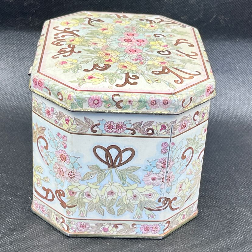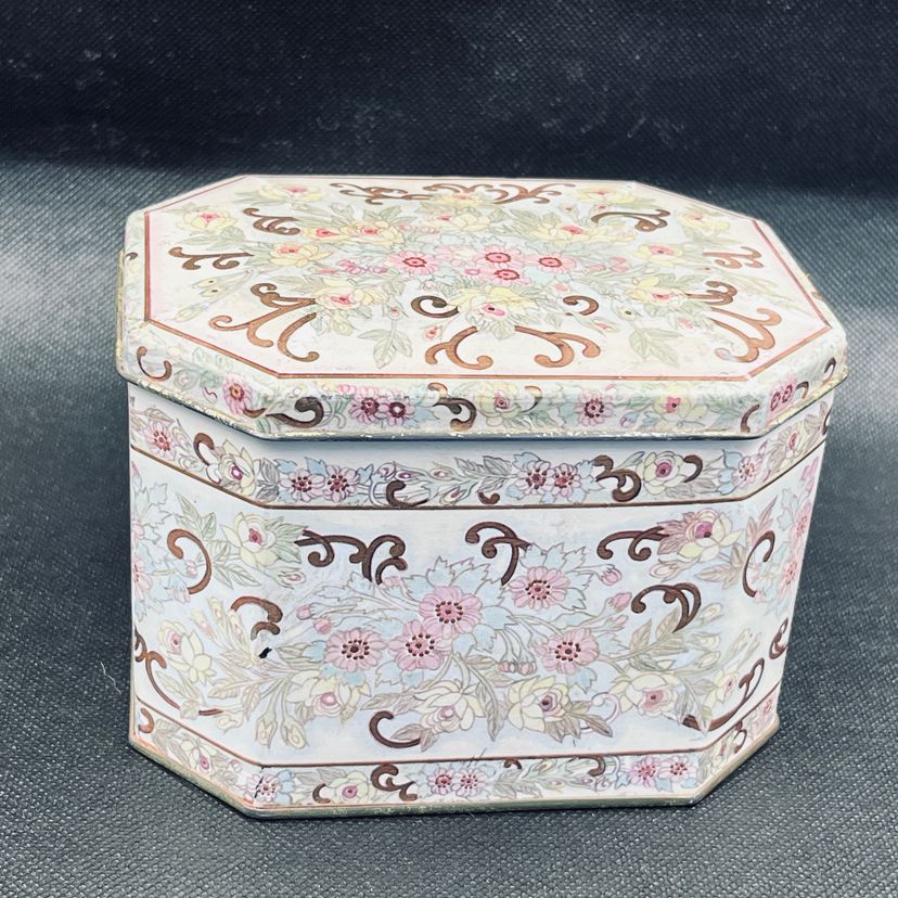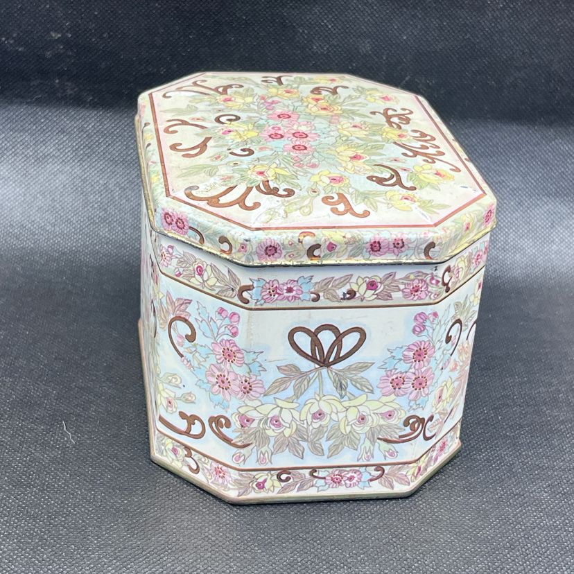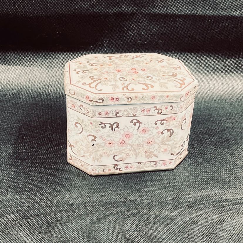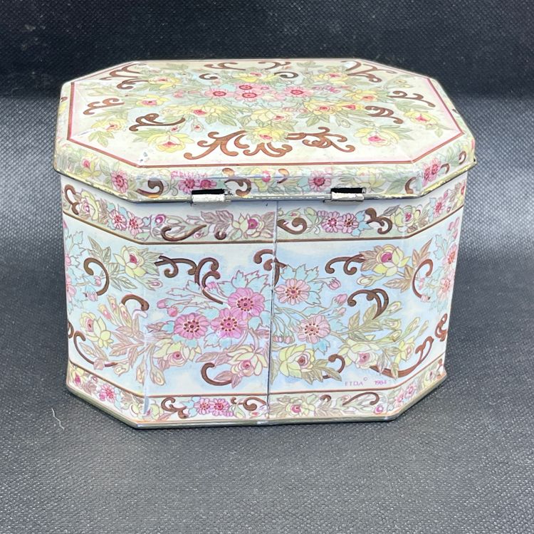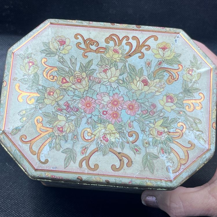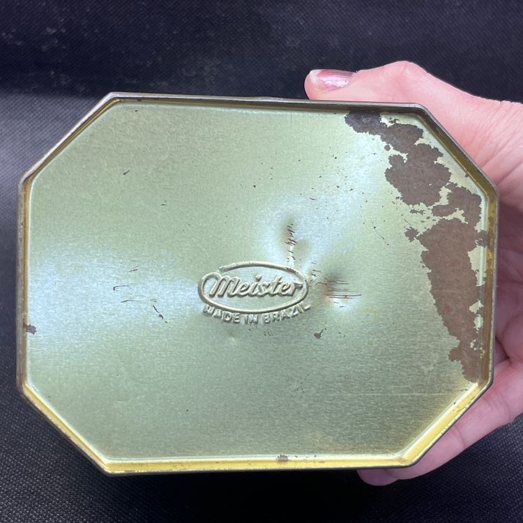 Hinged lid works well. Some rusting on the bottom outside. Not rusted throughMeasures 5.5"x4"x4"