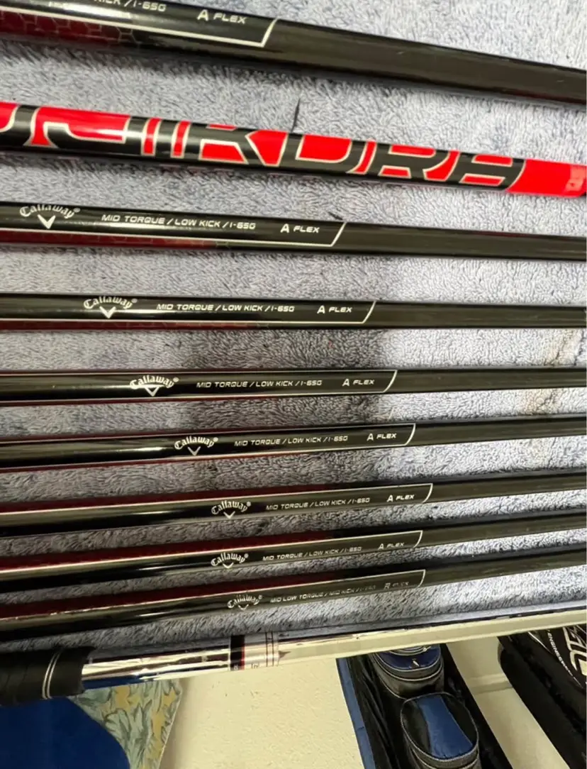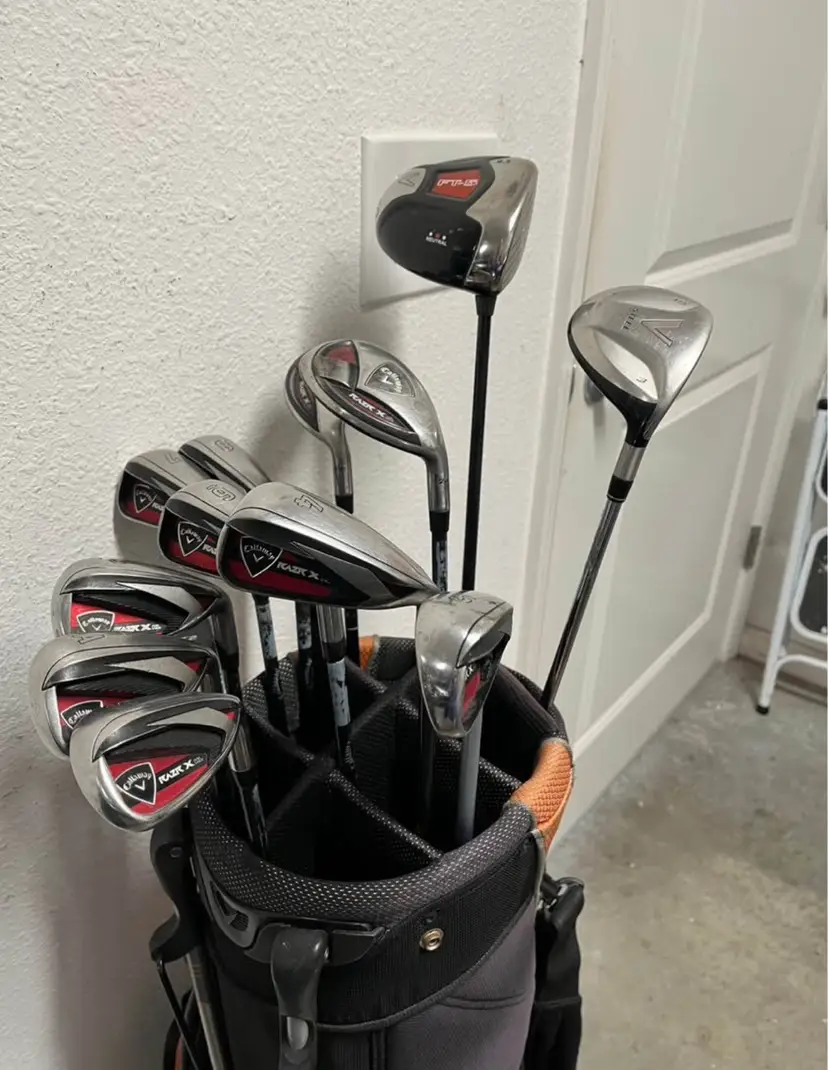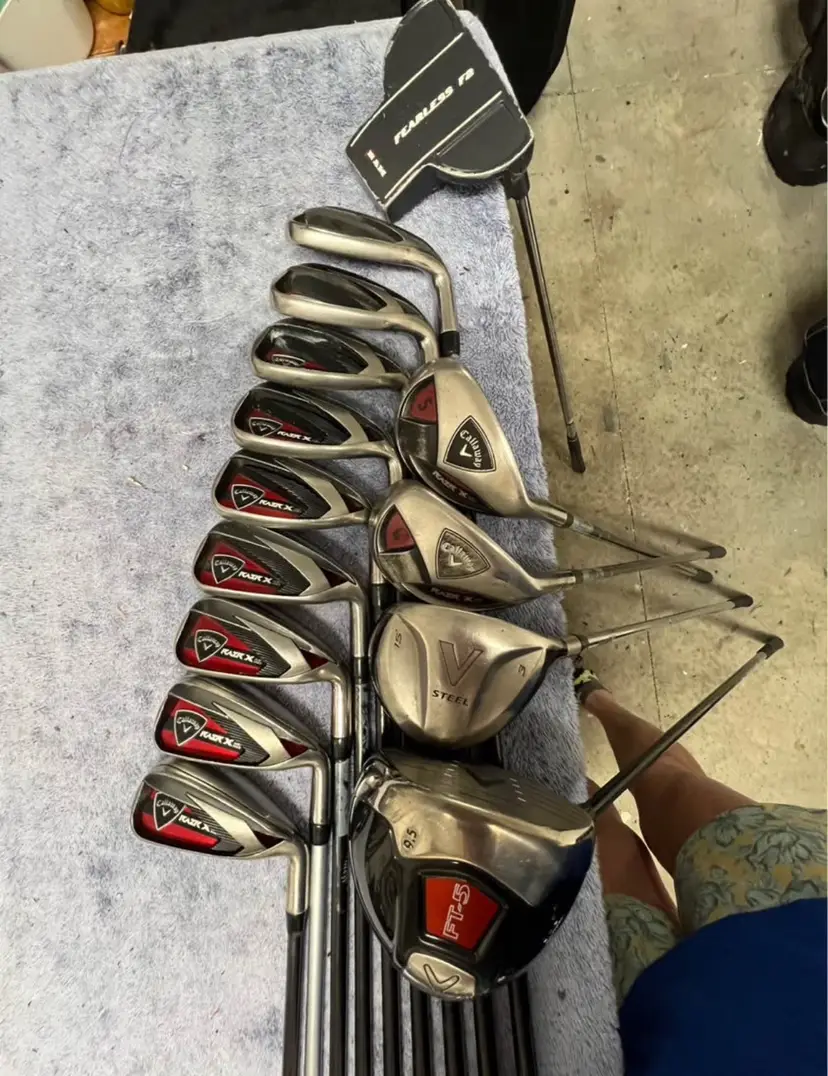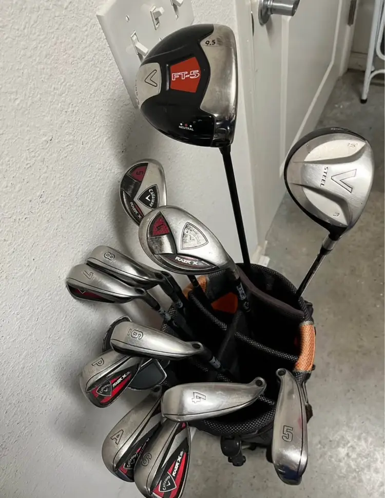 Men RH Callaway RAZR X club set. ALL Callaway!!!! Driver 9.5. FT-5 3 wood—V steel 4/5 hybrid RAZR X 4-9, Pw, Sw, Aw—RAZR X Putter— Ram Fearless Callaway stand bag Graphite, larger grips on most and are in great shape. A flex on all but driver is Stiff. This is a great set for beginner, intermediate, casual player spare set at home want to step up your game this would be a great set. It has a little bit of all the types of clubs for you all packaged up in a nice Callaway bag. I’m ready to go on the course.