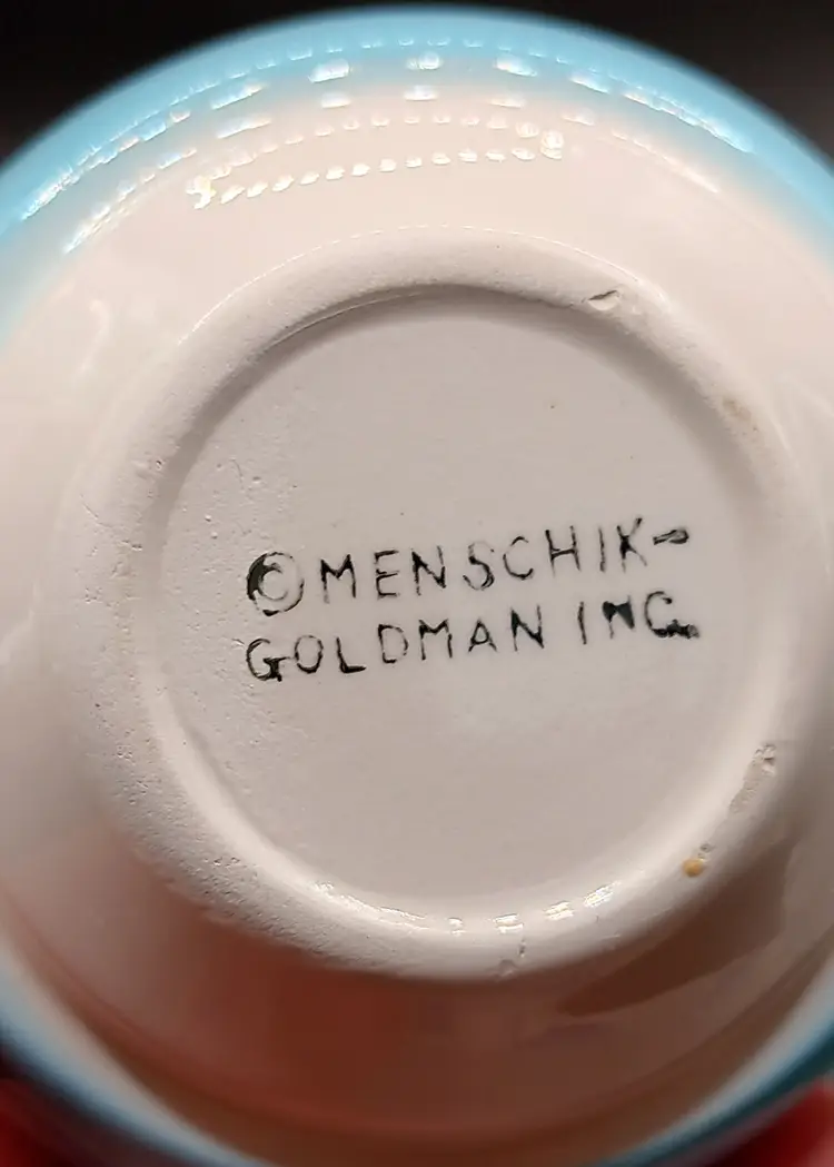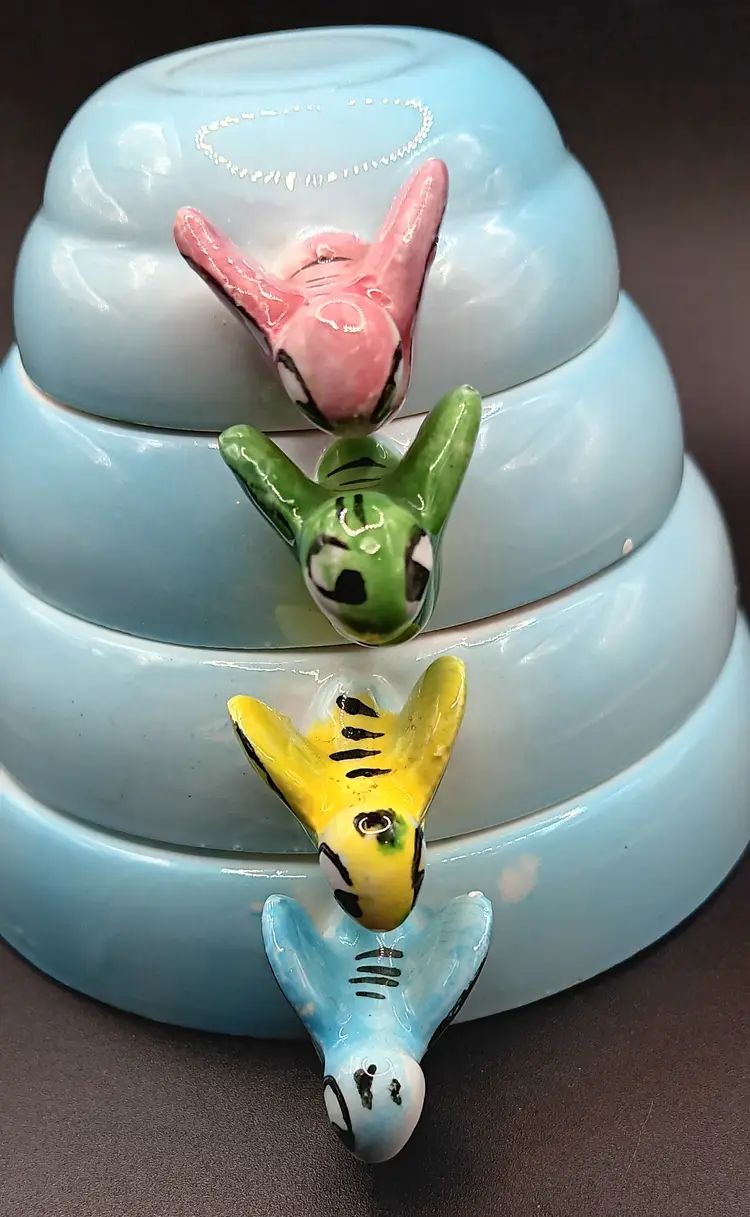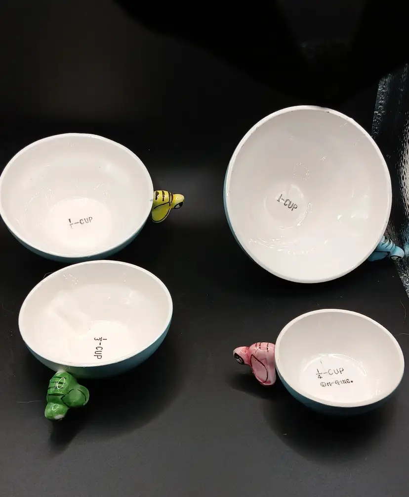 1950's ceramic stacking measuring cups. It is a complete set. Excellent condition. Stands 3.5" tall.