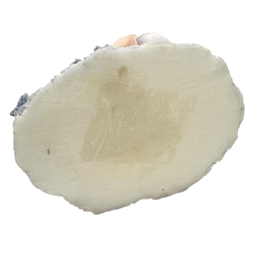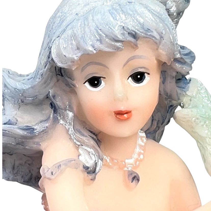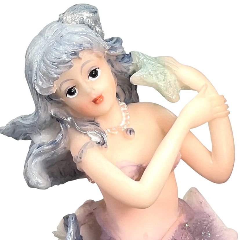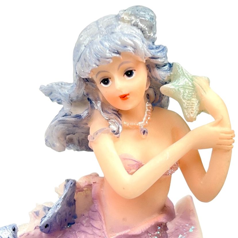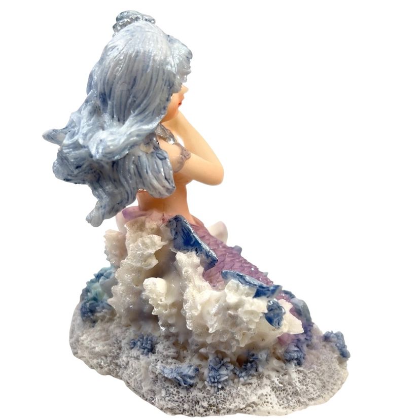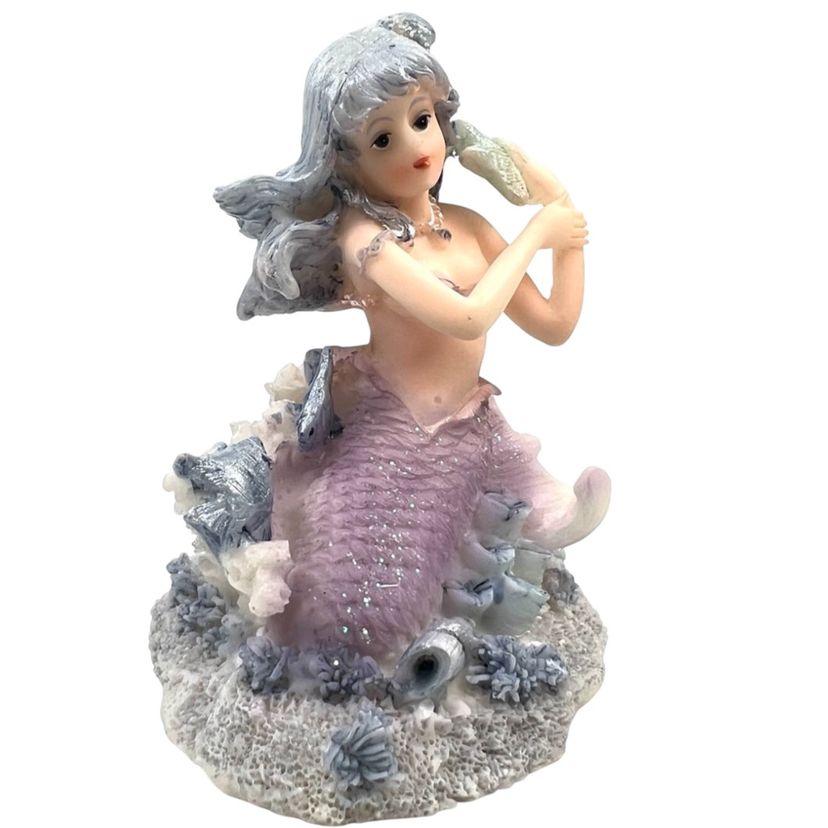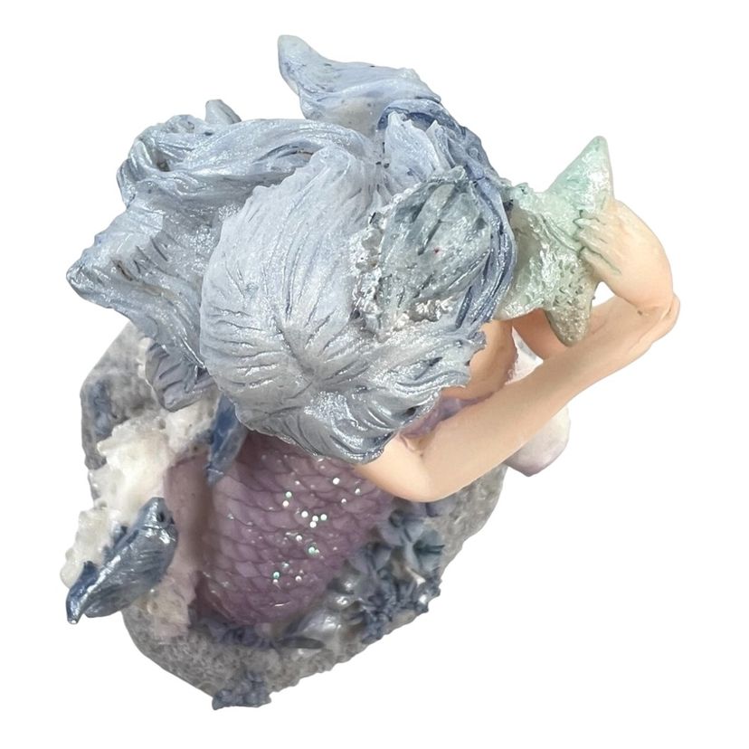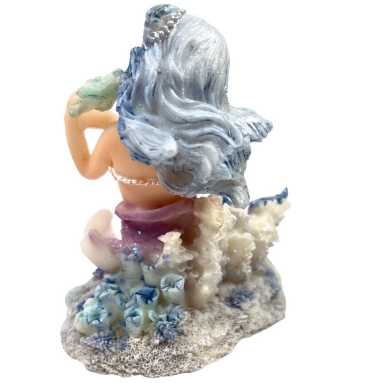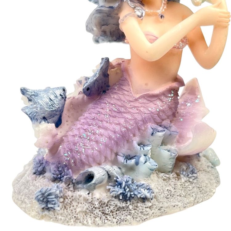 Mermaid Resin Figurine is Perched on a Coral Reef Under The Sea. Seashells, Fish, and Starfish surround her. Lovely Flowing Blue Hair. Mermaid Has Shell Necklace & Purple Sparkly Tail. 3-3/4” Tall x 3-3/8” Length x 2-1/2” Depth. Weighs 6 ounces. No condition issues. There’s a little bit of sticker residue on bottom but it’s not sticky.