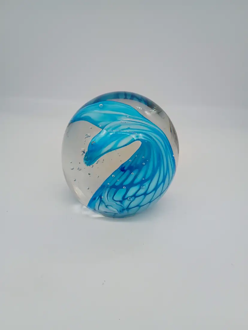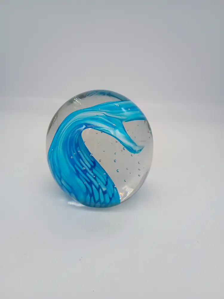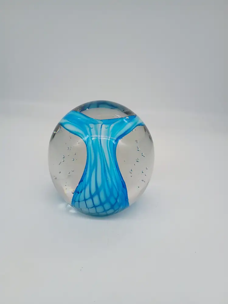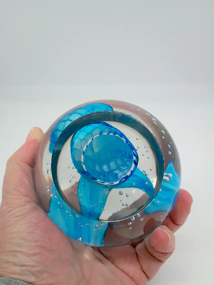 Mermaid Tail / Whale Tail Hand Blown Art Glass Paperweight 4 inch Diameter Aqua Blue with Bubbles. This is preowned, No Chips cracks or flea bites, no bruises or inclusions or fractures. Excellent condition. Ships USPS domestically, UPS International Shipping globally