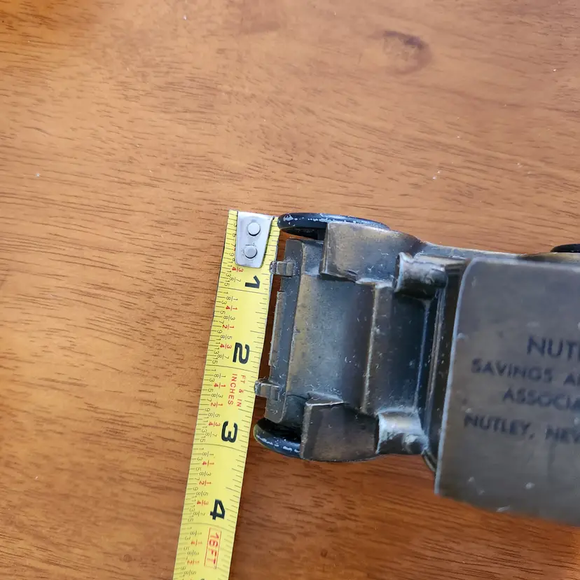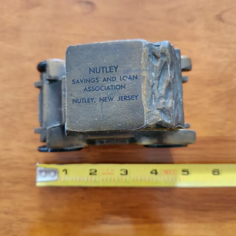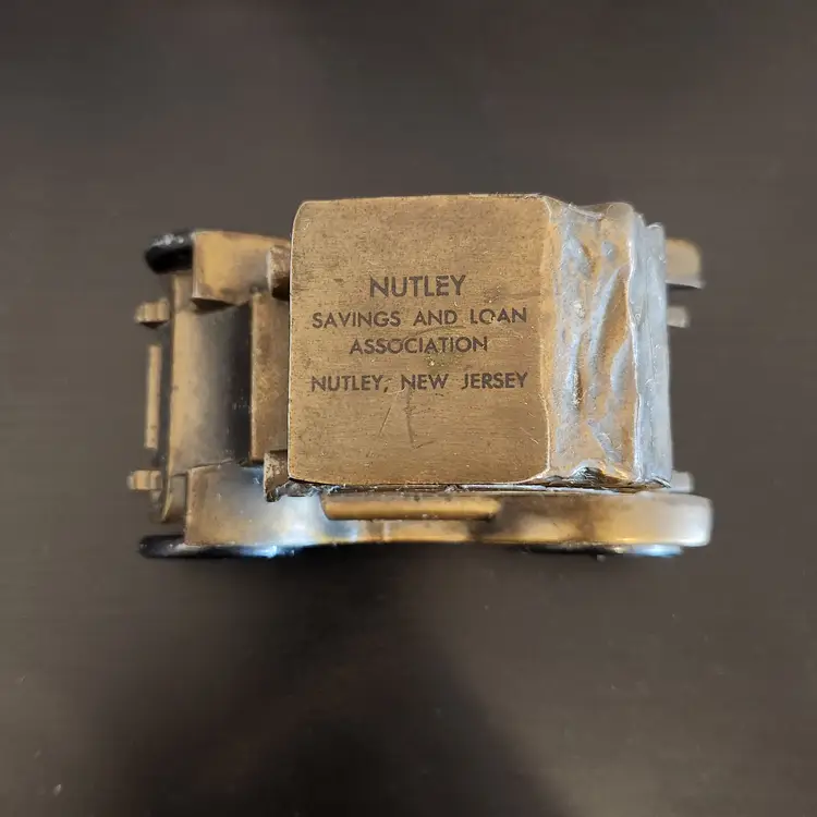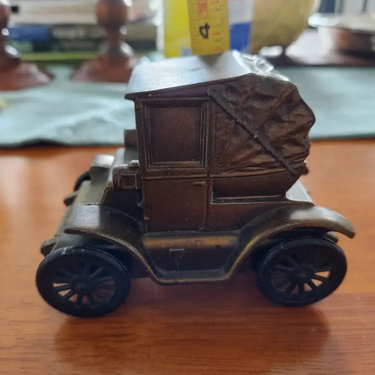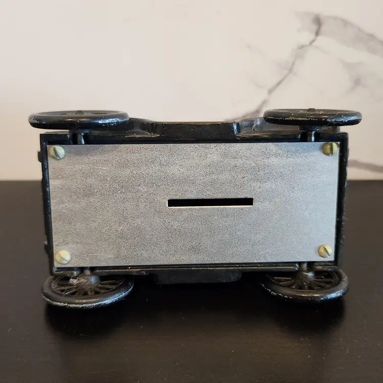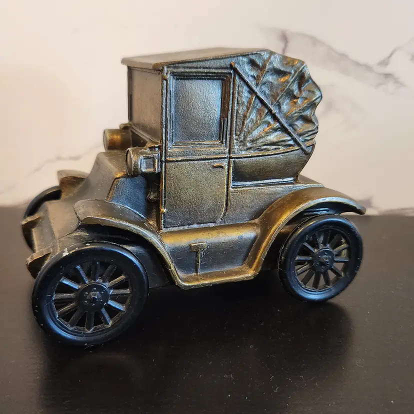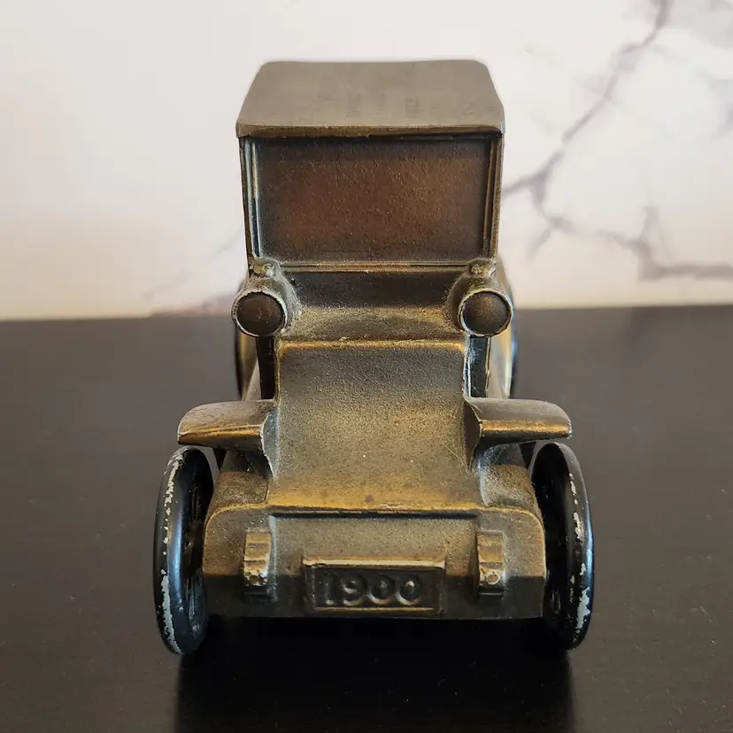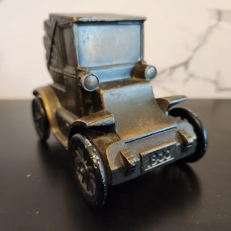 Metal coin bank, one of a series from Banthrico, Chicago, this is the 1900 Baker Electric Car / Pillbox Coupe. These were made in the 1970’s and were frequently personalized to advertise different business' These are made of DIECAST “white metal” with the brass color being applied through an electroplating process and finished with a clear lacquer. The wheels roll and are also metal. Very cute for a little boys room or nursery.