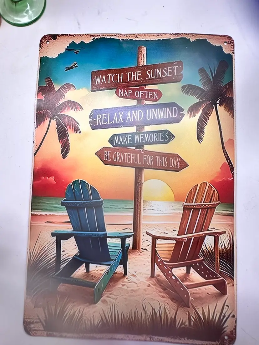 Colorful beach sign with signs that have encouraging words onf each. Approximately 12”. X 8”. New. It had a rough trip to me and arrived with bent areas. (Shows up best on back side—see pics) Still a beautiful sign with beautiful sentiment and at a reduced price.