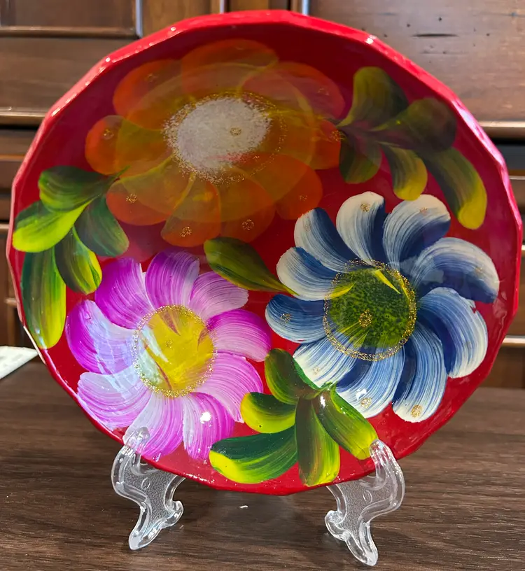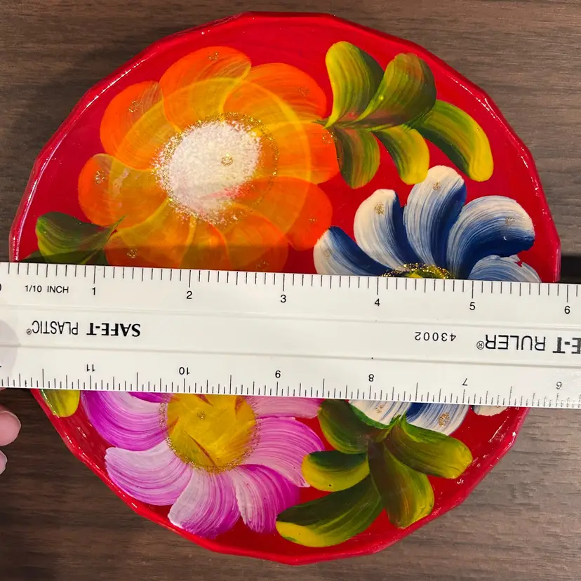 Mexican Pottery 3 footed bowl. Talavera and glows under black light. I do not see any markings. Great piece with beautiful colors. Measures 6 inches in diameter and 2 inches deep. Stand not included.