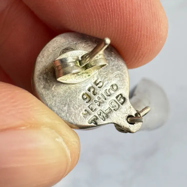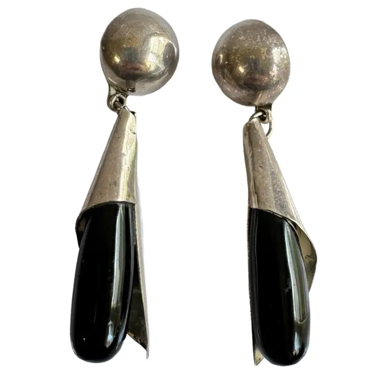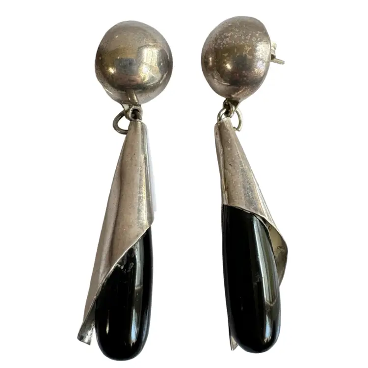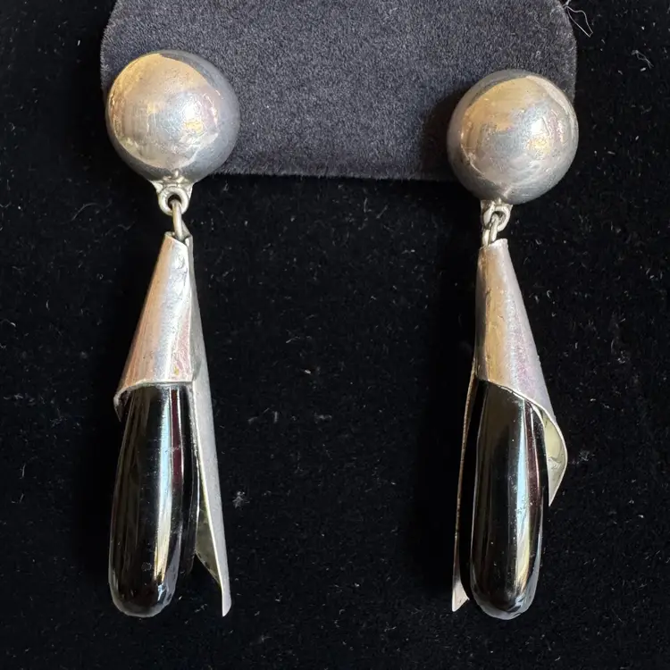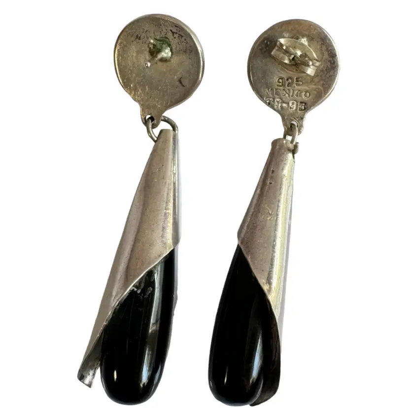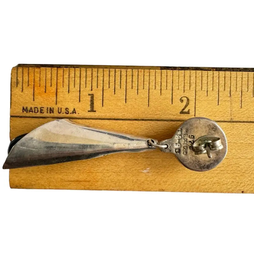 Excellent vintage condition with minor tarnish. Missing one back. For pierced ears. Marked 925 Mexico and tested sterling silver. About 2-1/4” long.