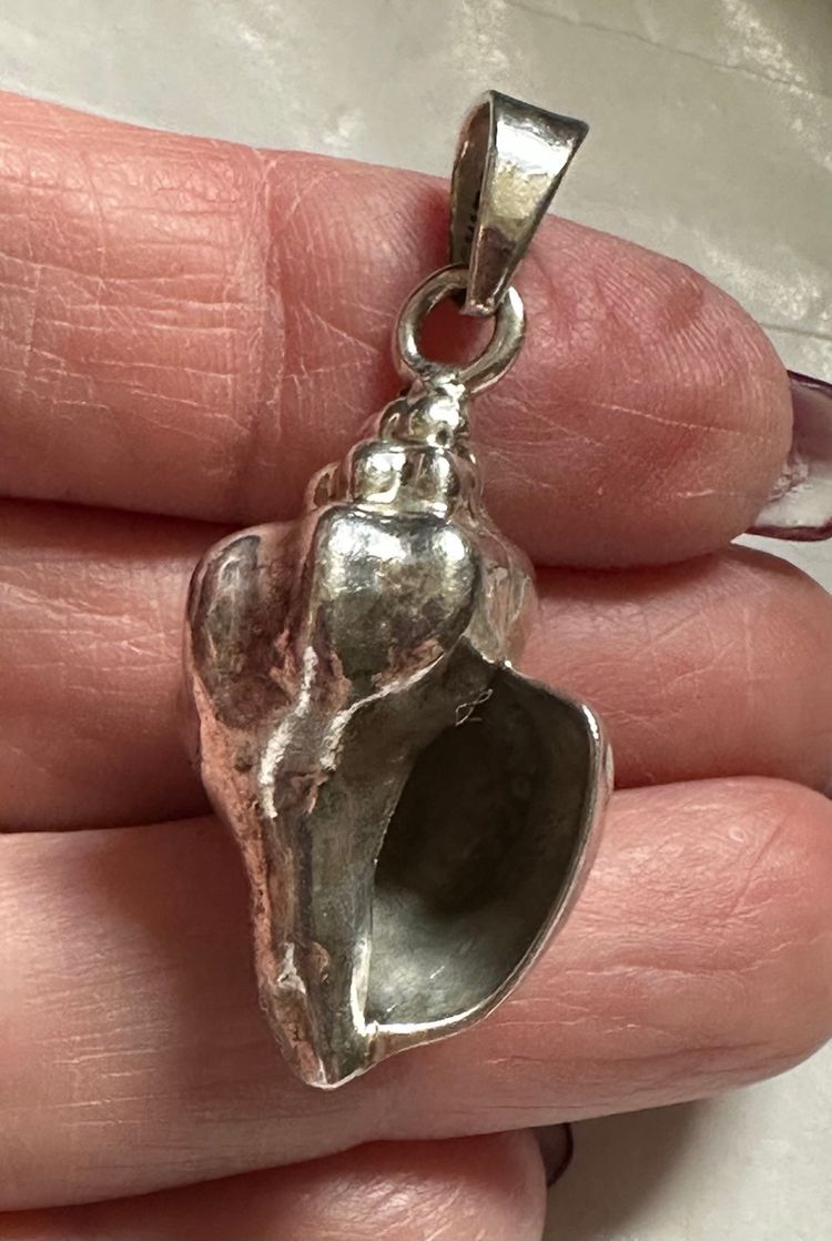 Vintage Mexico 925 Sterling Silver conch Shell pendant. It has a 3-D design and measures approximately 1.5” with the bale. It weighs 7.4 grams. Excellent condition.