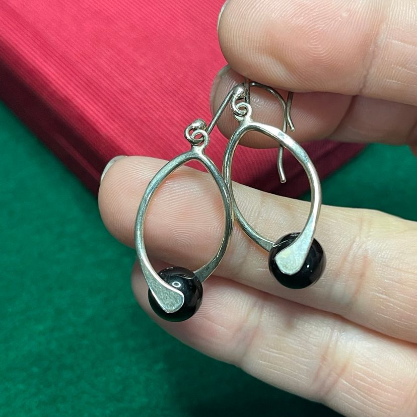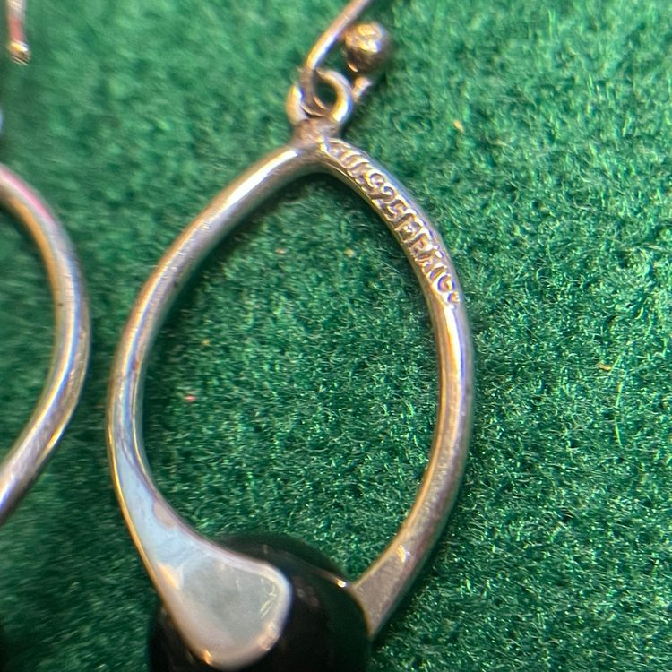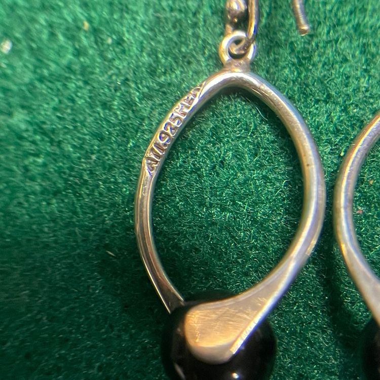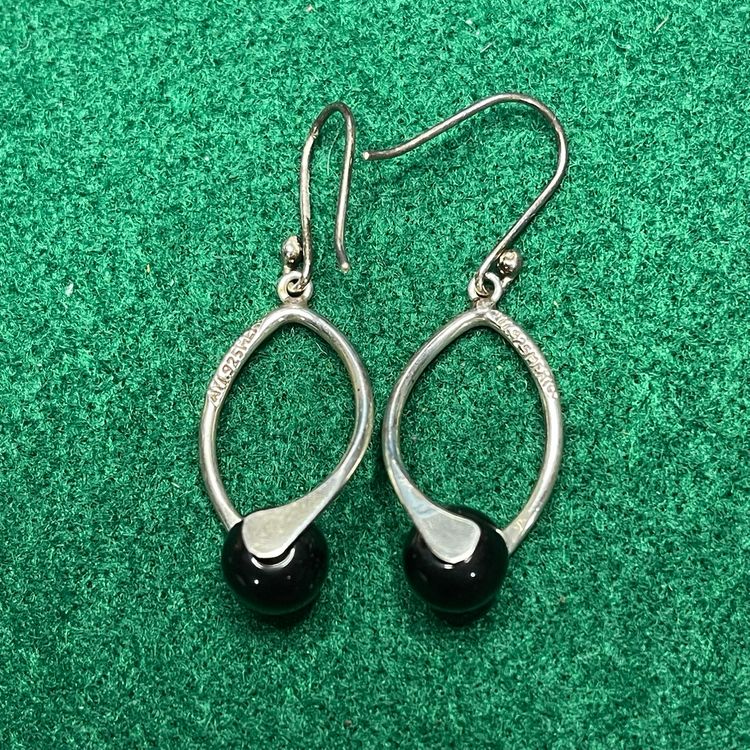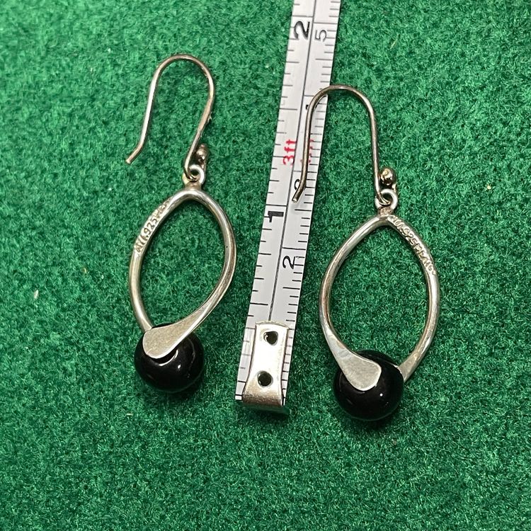 In good condition with only minor imperfections. The stones are also in good condition. Each earring is marked and about 1-5/8 inches long from the top of the hook to the bottom of the onyx.