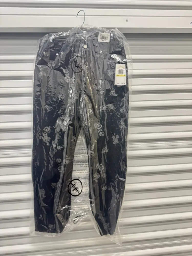 Few things are: Camo jacket $265 Red dress size 4 - $155 Navy floral dress size 8 -$175 Dress $175 Black skirt size Large $195 Black jeans with silver flowers size 4 - $125 Blue and white floral dress size 0 - $295