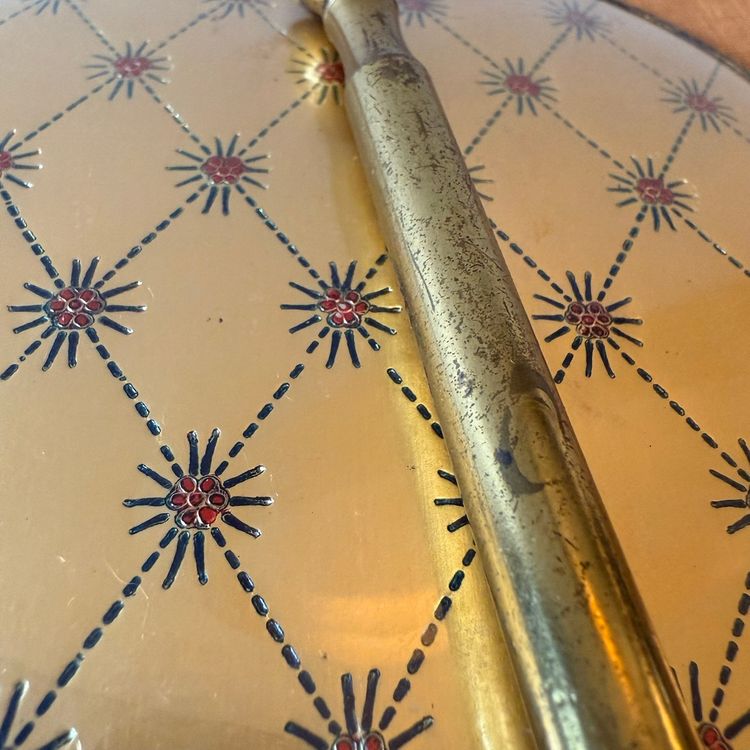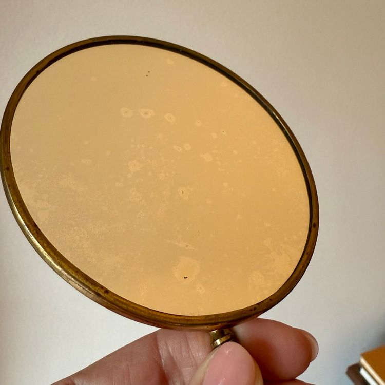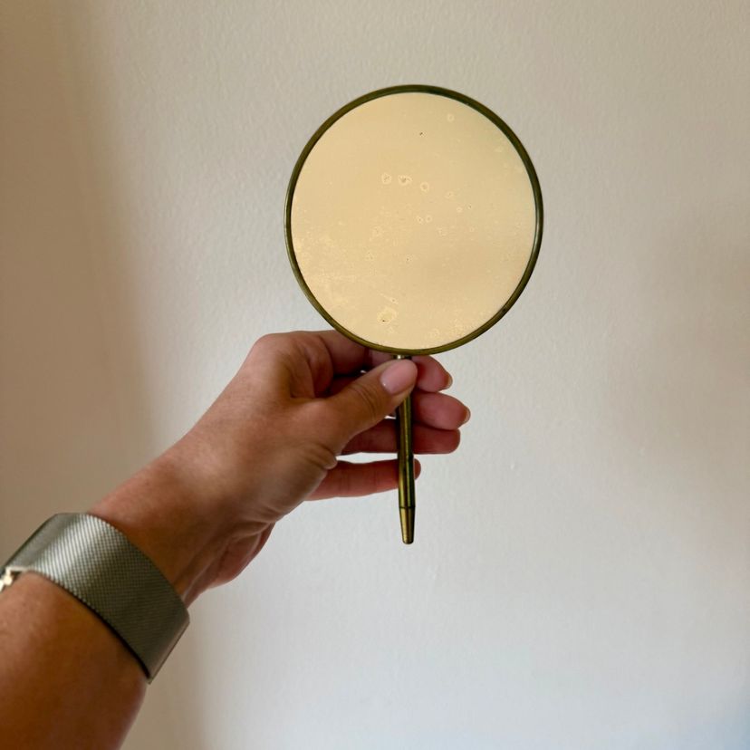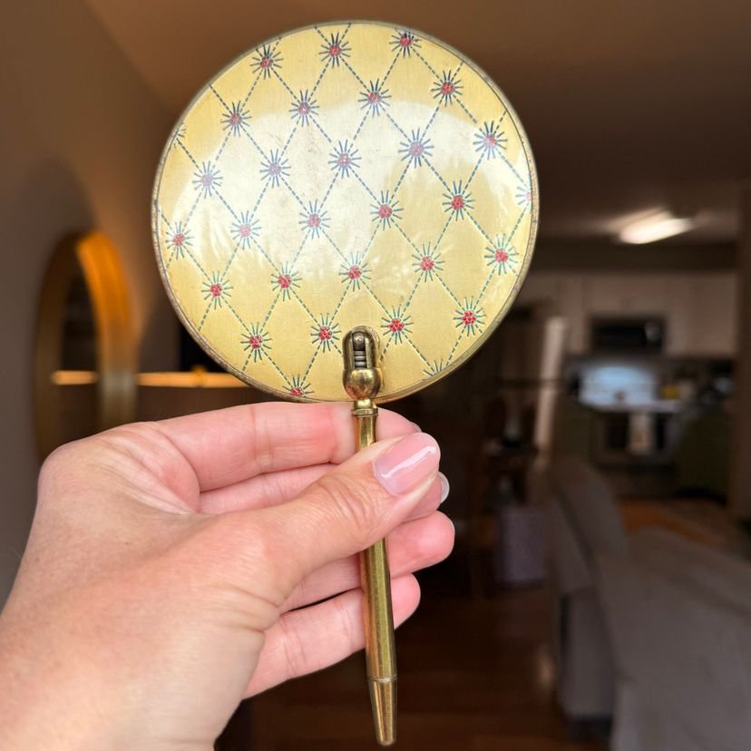This incredibly unique mid-century magnifying hand mirror is full of charm and thoughtful design. It features a sleek brass handle that not only feels sturdy and substantial in your hand but also folds down for easy storage or display. Even better, the mirror can stand upright, making it perfect as a tabletop mirror when you need hands-free use.