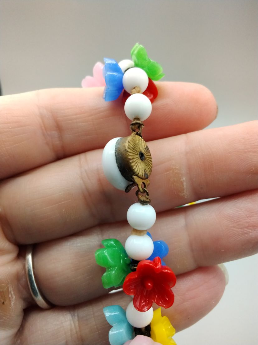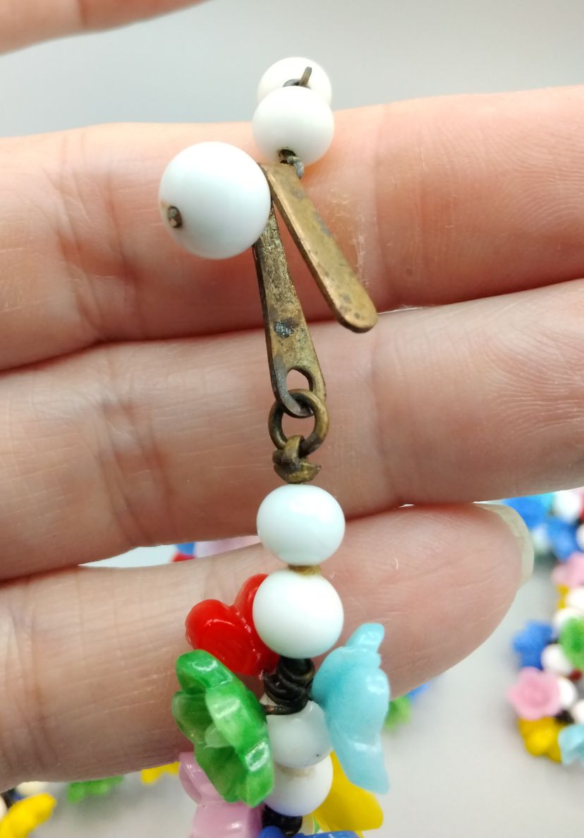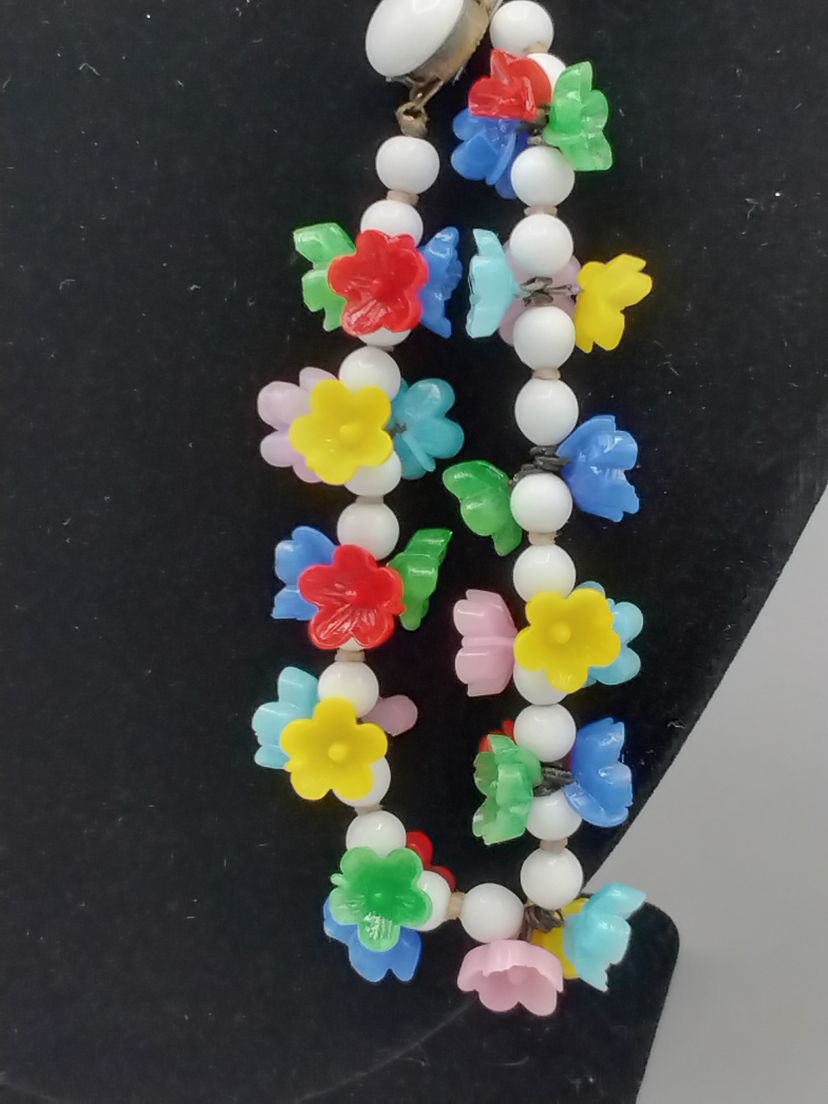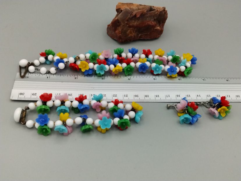This fun, whimsical and colorful floral Czechoslovakian Milk Glass Beads, come in a three piece matching set. The necklace has Knotted Silk thread, a Shepherds Hook Clasp, and a collection of six different tiny colored milk glas flowers, assembled in clusters on a 14 inch lenght. The 8 inch long bracelet has a special secured pinch and pull Clasp, that is covered in a large white Milk glass Cabachon. The same combination of colorful flowers can be found on the bracelet. This set of earings are screwback earings with one set of the colorful flowers hanging in a cluster. Considering the age, use and the fact that these delicate tiny flowers are glass. Only one red flower on the necklace is broken. The clasps on the necklace and bracelet are discolored from age, but the screwback earings are still shiny. None of the hardware is tested for silver content.