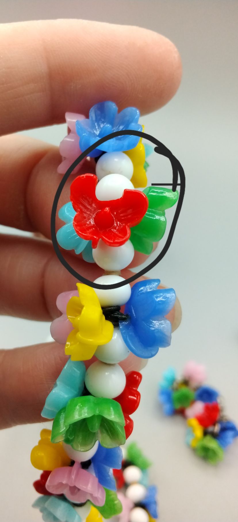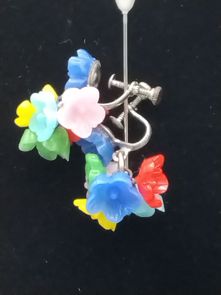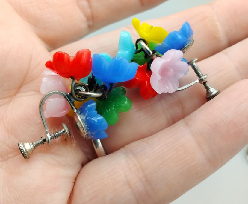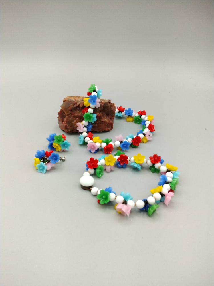 This fun, whimsical and colorful floral Czechoslovakian Milk Glass Beads, come in a three piece matching set. The necklace has Knotted Silk thread, a Shepherds Hook Clasp, and a collection of six different tiny colored milk glas flowers, assembled in clusters on a 14 inch lenght. The 8 inch long bracelet has a special secured pinch and pull Clasp, that is covered in a large white Milk glass Cabachon. The same combination of colorful flowers can be found on the bracelet. This set of earings are screwback earings with one set of the colorful flowers hanging in a cluster. Considering the age, use and the fact that these delicate tiny flowers are glass. Only one red flower on the necklace is broken. The clasps on the necklace and bracelet are discolored from age, but the screwback earings are still shiny. None of the hardware is tested for silver content.