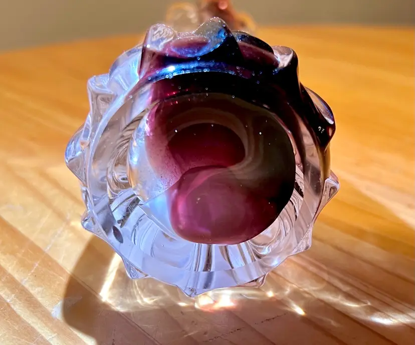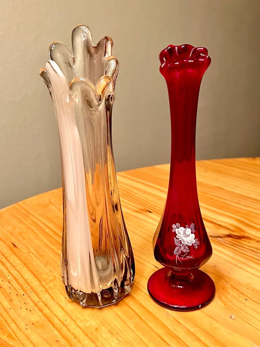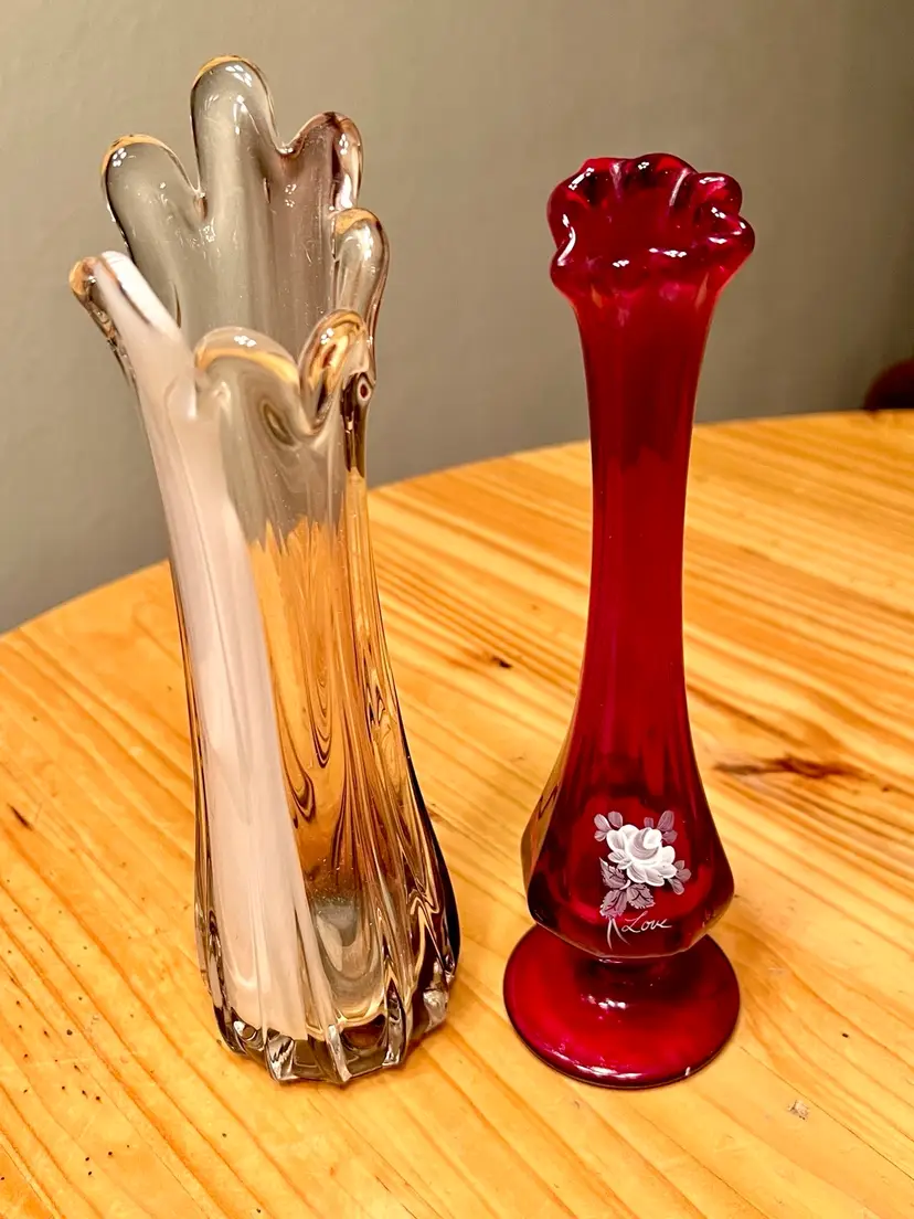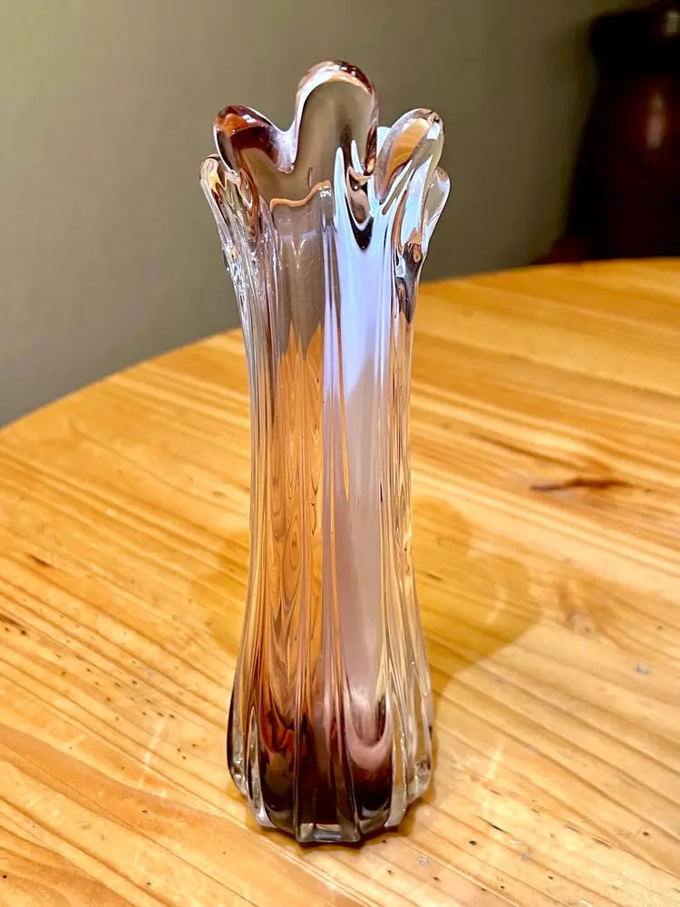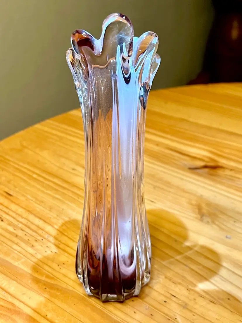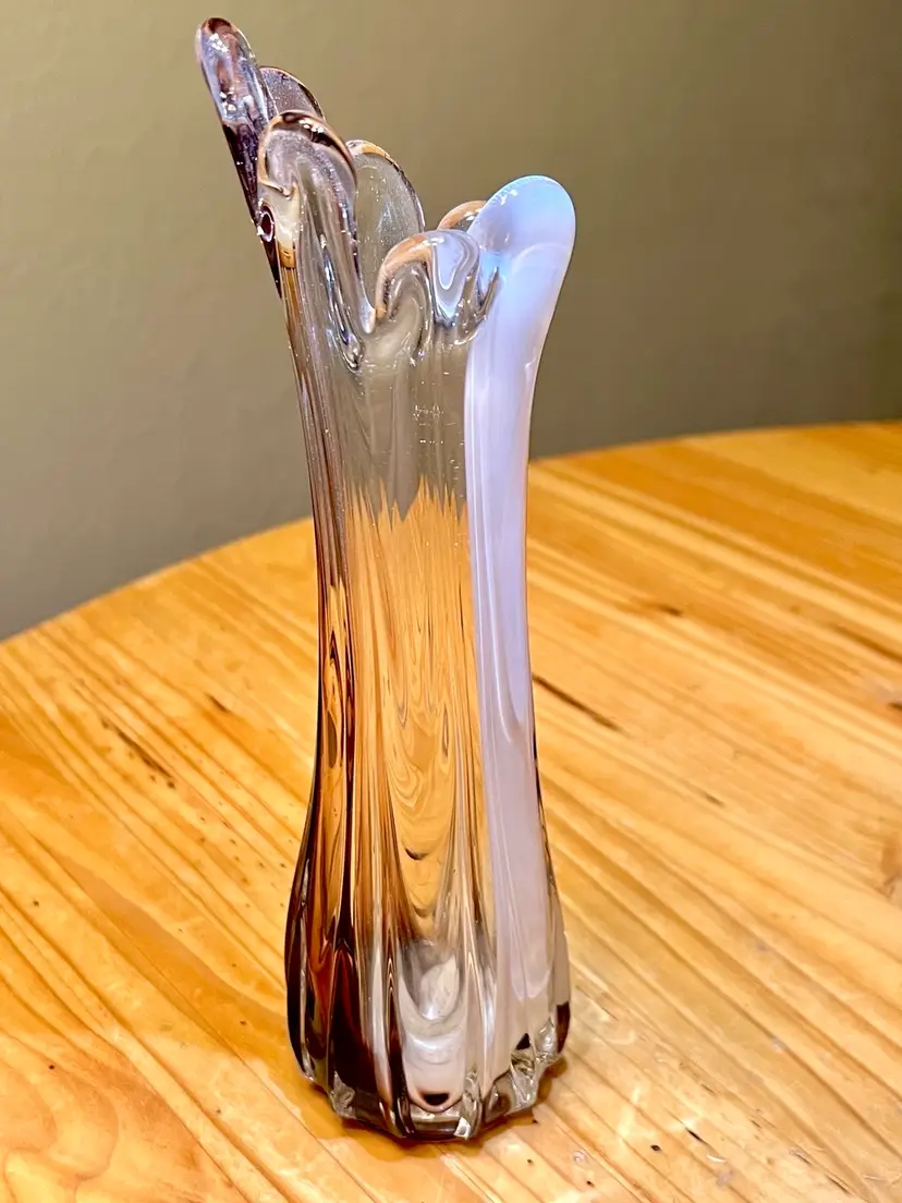 🤍Gorgeous and unique eight finger swung vase, with amethyst and white columns! This vase has no makers’s mark, but is most likely an import from Taiwan circa the mid century. She is great vintage condition, free from cracks or chips, and stands a little over 9” tall. #swungvase #vintage #vintageglass #midcenturyglass #mcmglass #handtooledglass #Import #taiwan
