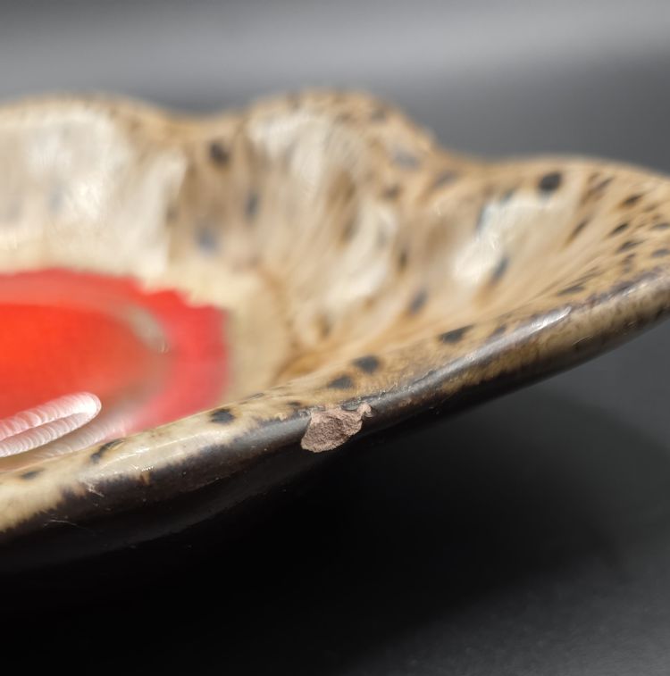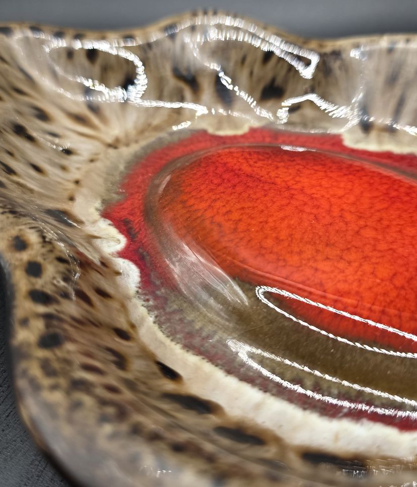 Add a bold splash of color and organic elegance to your collection with this striking mid-century ceramic dish. Leaf-shaped with undulating edges, the piece features a fiery red glazed center with a crackled finish, radiating outward into a gradient of deep red and earthy brown tones. The outer rim showcases a speckled leopard-like glaze in beige and dark brown, adding texture and visual depth.