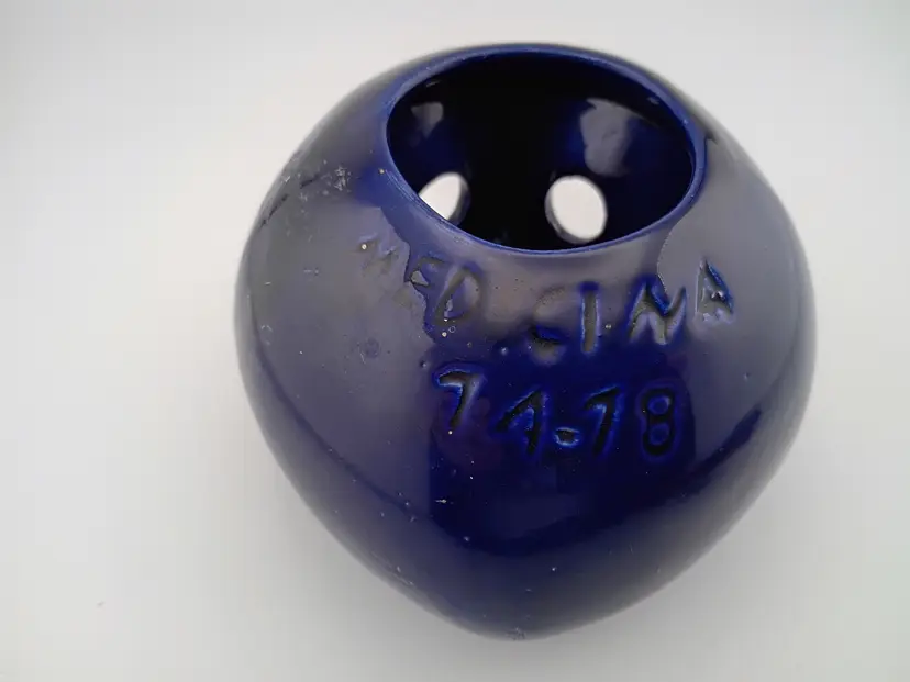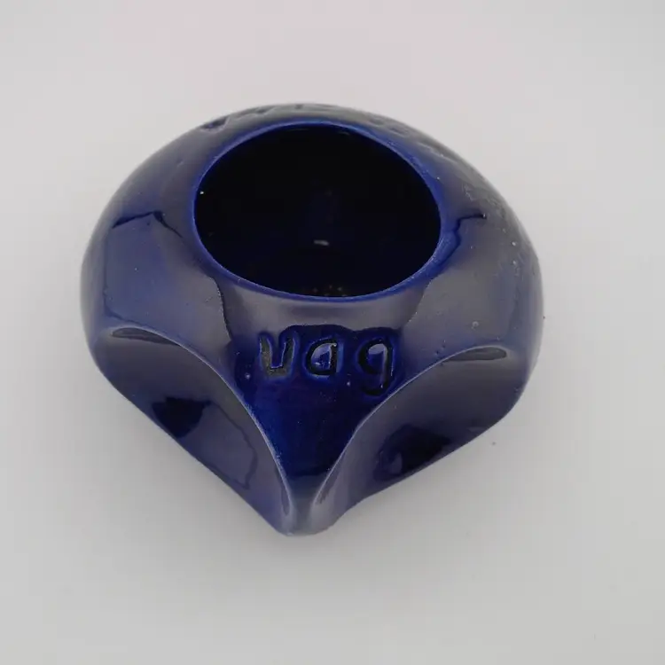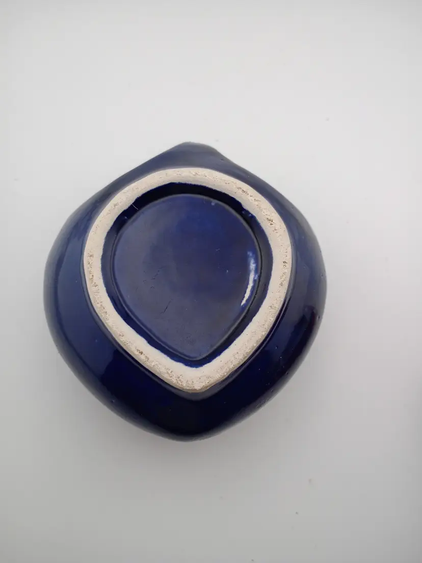 This is a very cool midcentury ceramic owl with a deep cobalt glaze. It may be a tea light holder. It is marked on the front and back, though I haven't been able to identify it. It's in excellent condition with no chips or cracks. There is a tiny spot of missed glaze (not a chip) on the front.