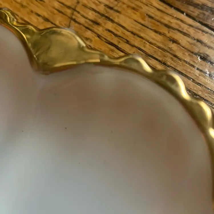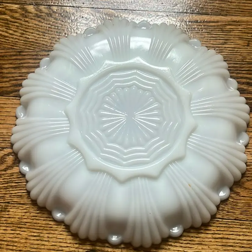 Heavy milk glass trimmed in gold for dozen deviled eggs or oysters. Barely felt chip as shown in last photo, not visible with eye