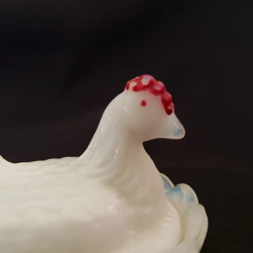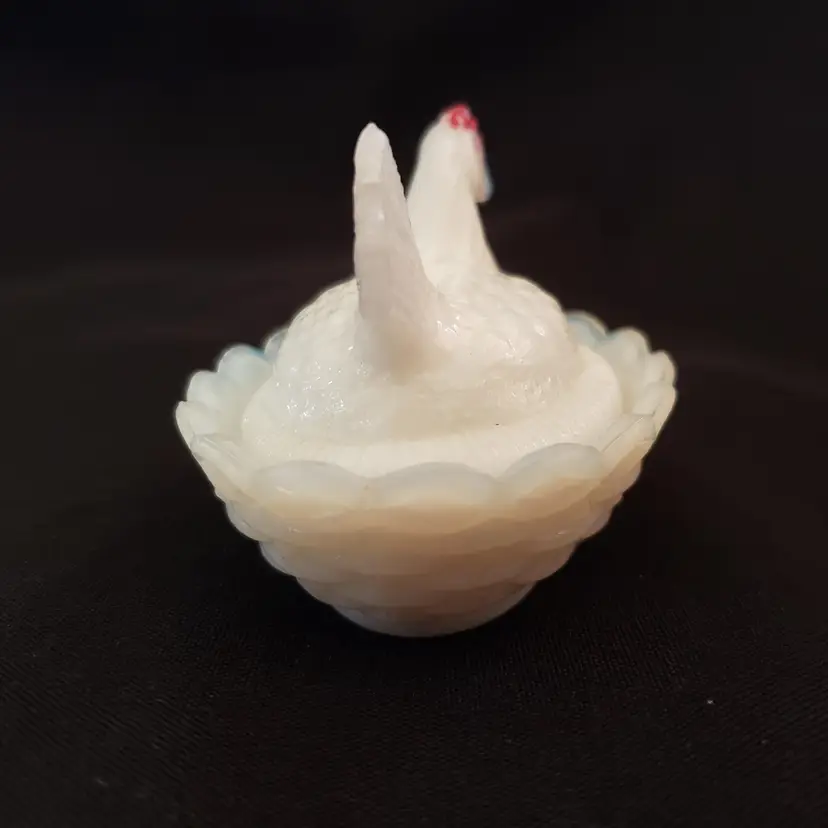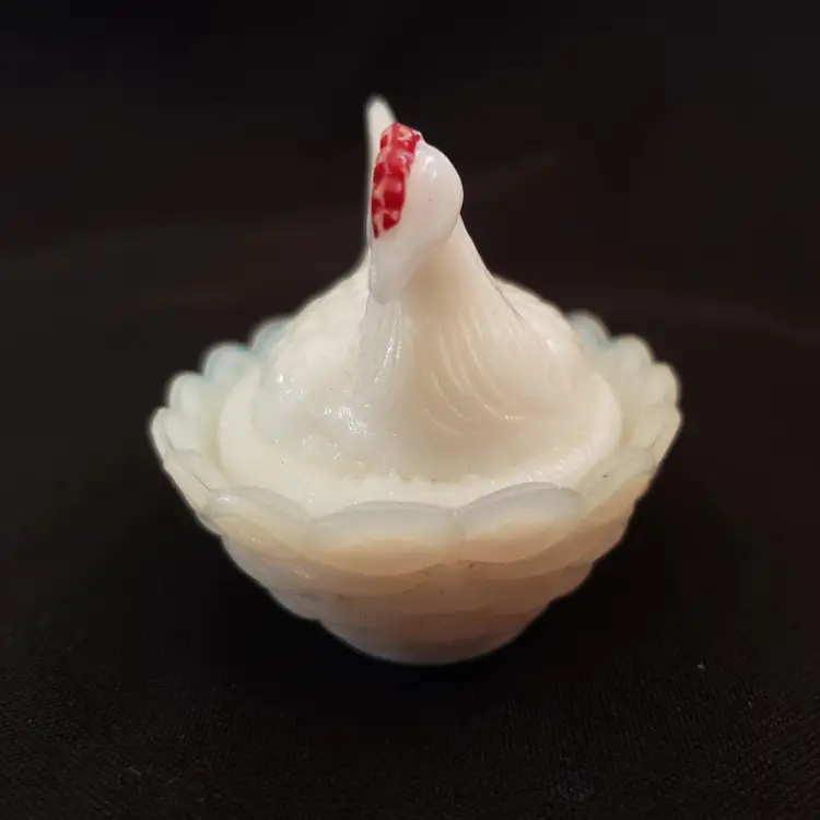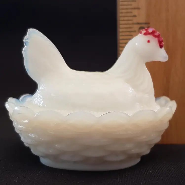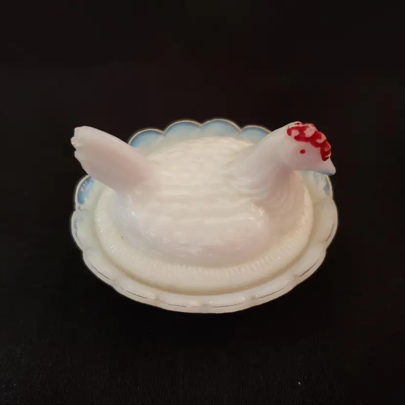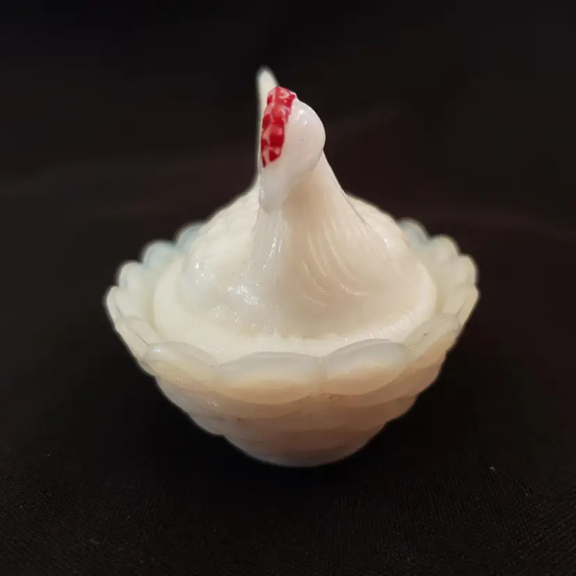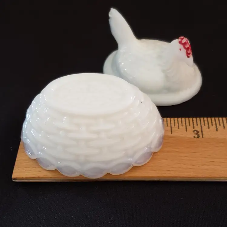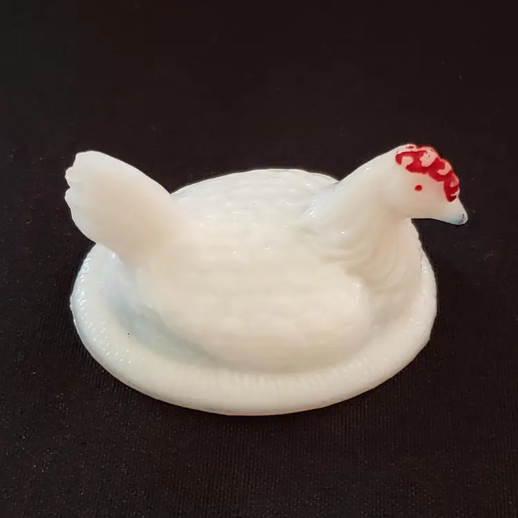Milk Glass Hen On Nest Covered Salt Dish Red Comb Miniature Unbranded with Issue. Used condition with missing red color both on crown and eyes, black dot (possible is permanent marker ink). Please view all the photos and read the entire item description and please ask any questions prior to purchase when possible.