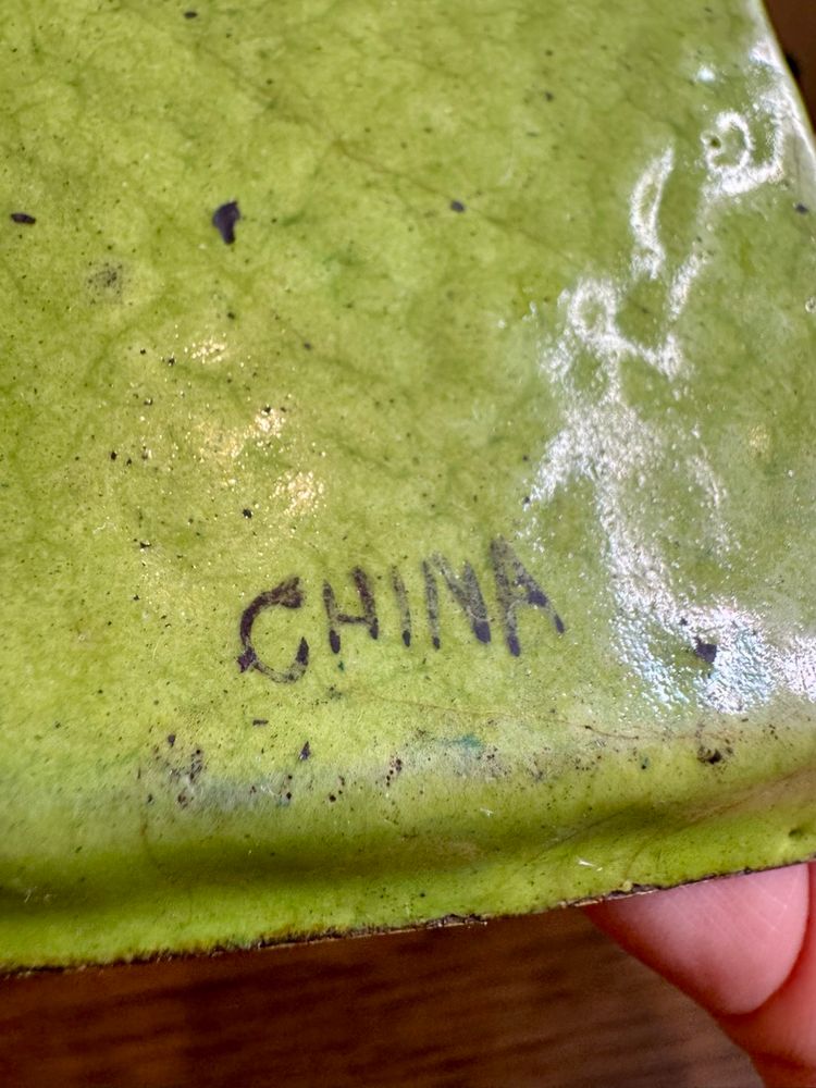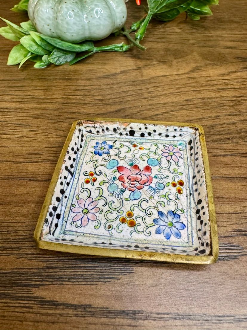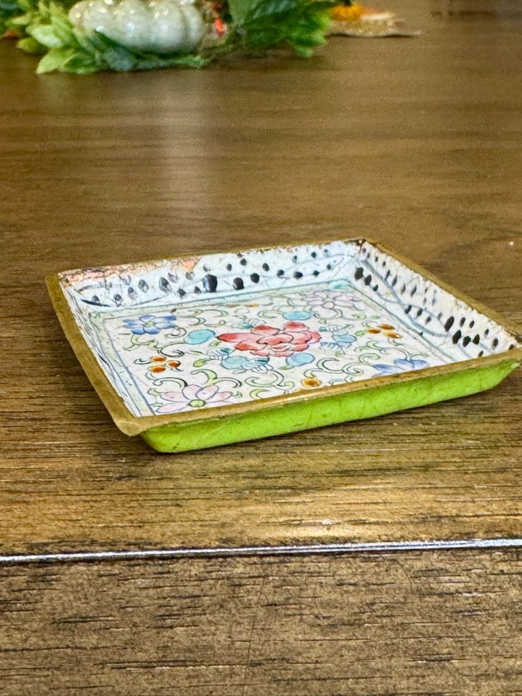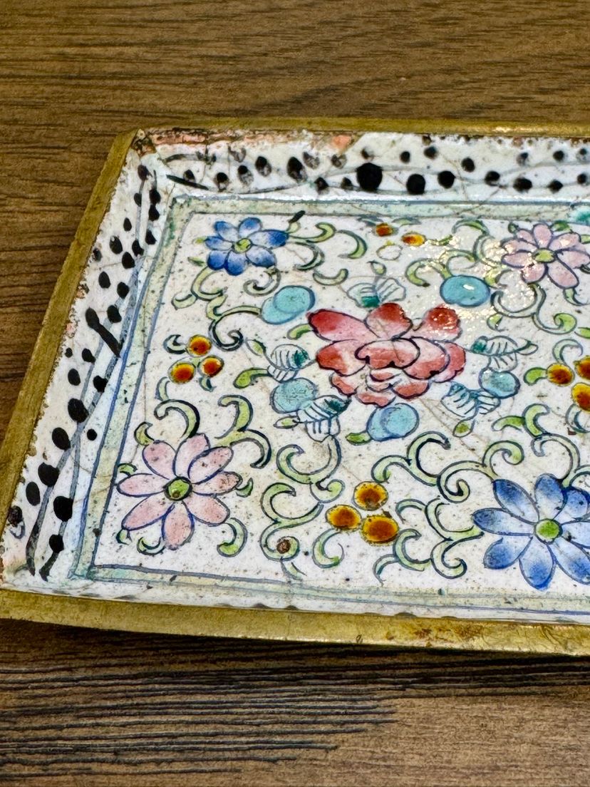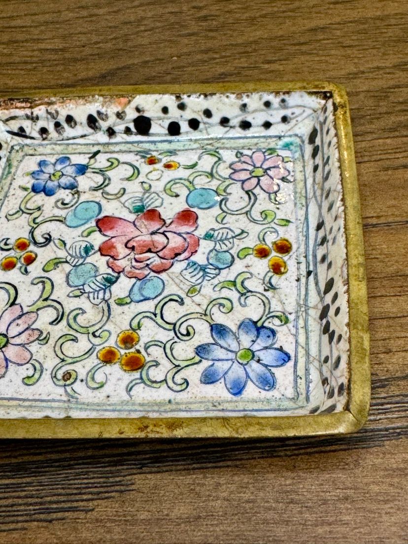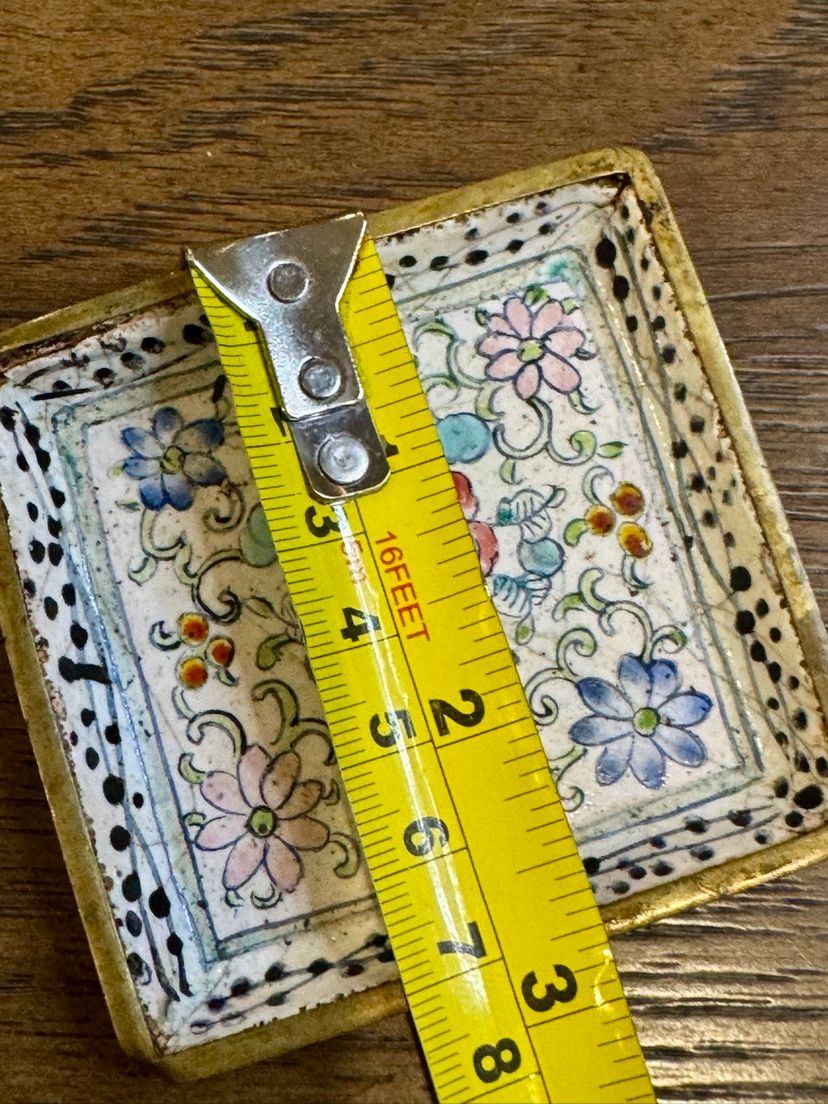 antique Chinese Canton enamel trinket dish, also known as a pin tray or trinket box. These items are typically made of enamel on metal, such as copper or brass, and feature intricate floral designs. Canton enamel is a type of painted enamel that originated in Guangzhou (Canton), China, during the Qing Dynasty. The style is often referred to as "Famille Rose" due to the pink and other vibrant colors used in the floral patterns. Similar items are often dated to the 19th century, particularly the late Qing to Republic period