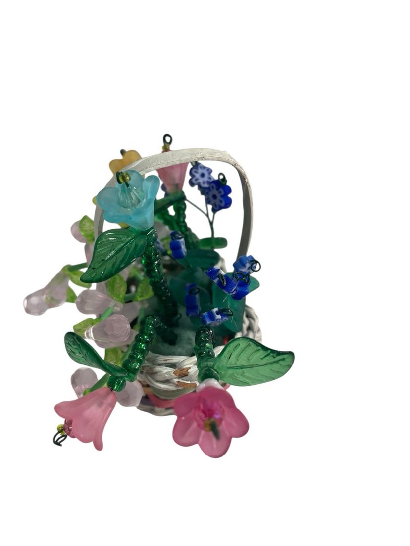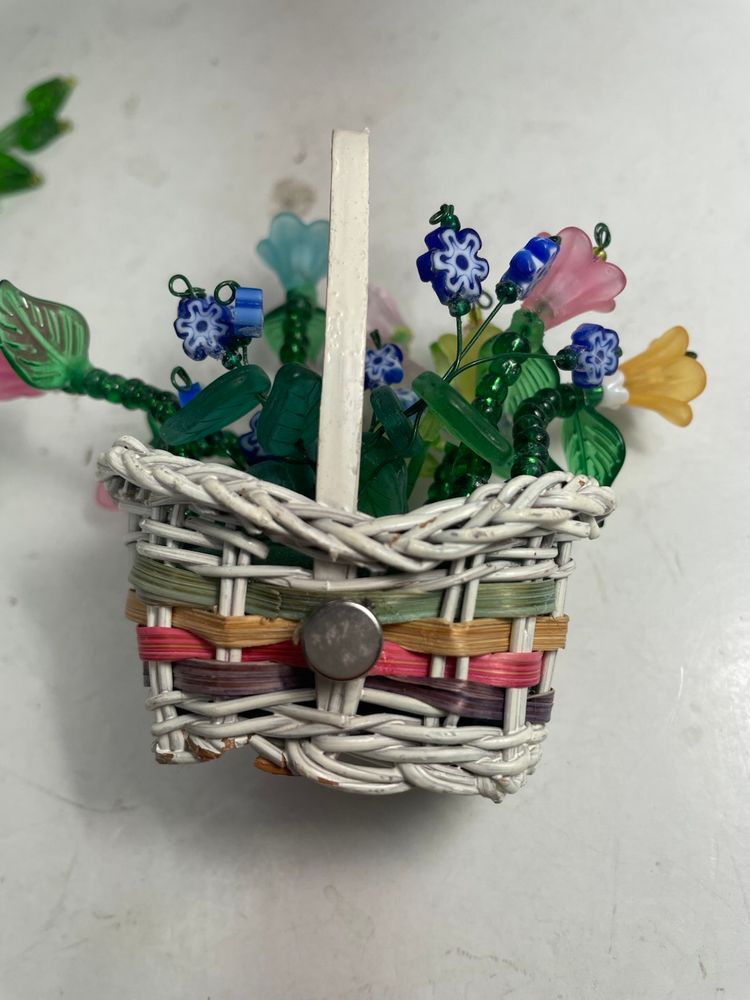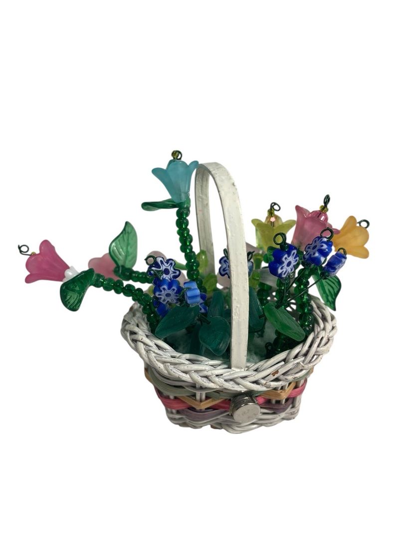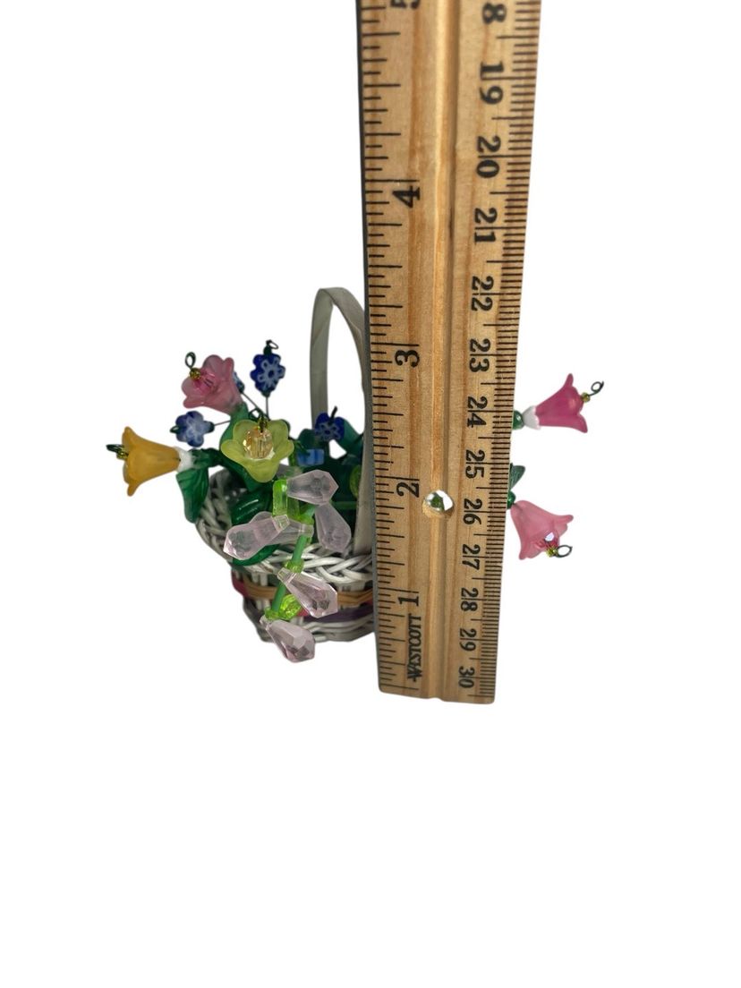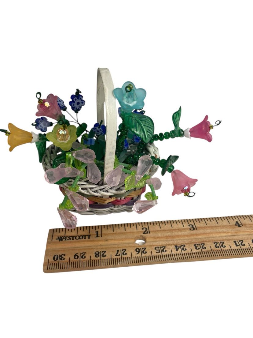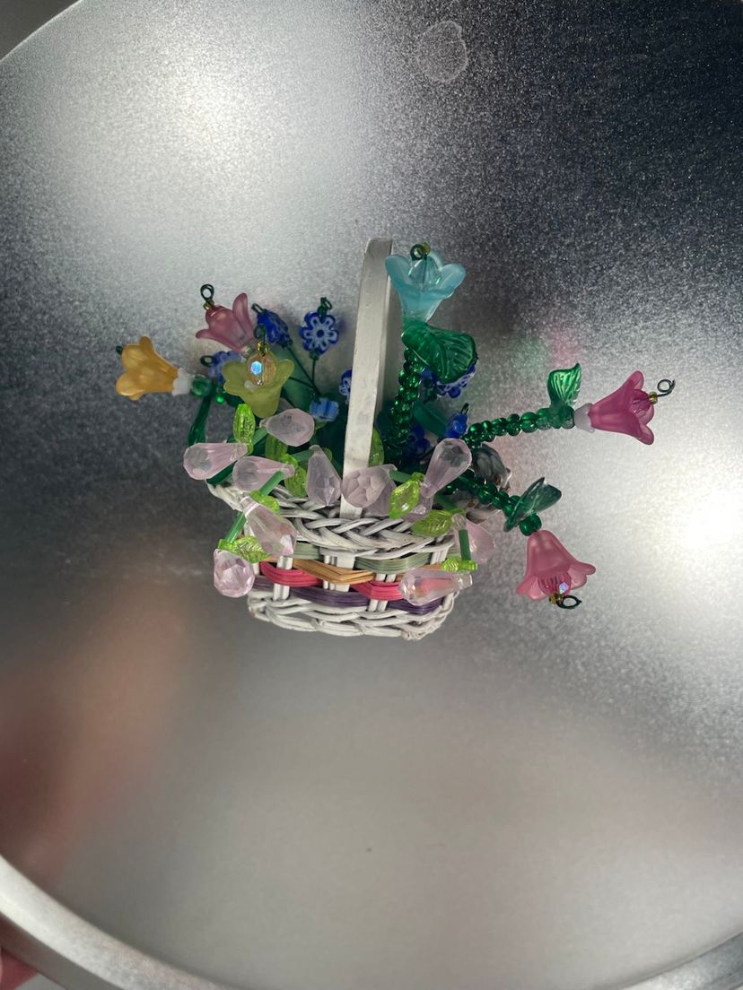 Height 3”, length 2.5”. Made with flower beads, acrylic leaves, seed beads. Attached ribbon. Heavy duty magnet. Mini basket bought from charity shop.