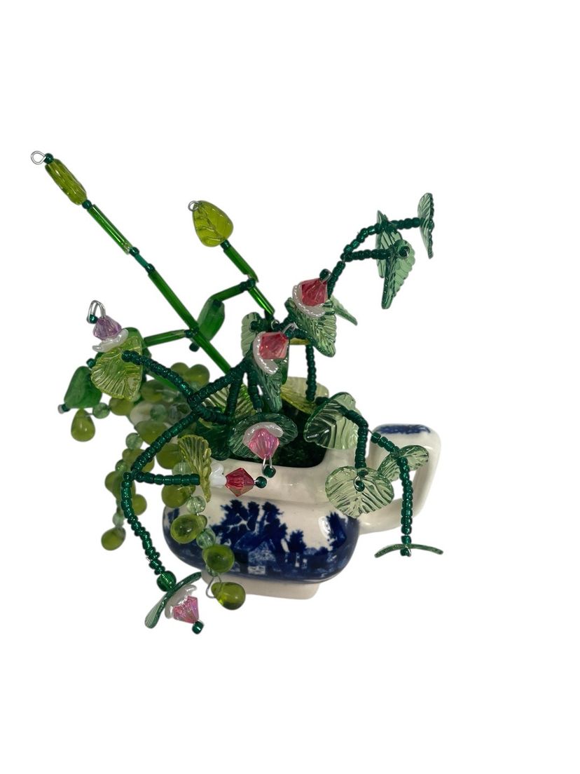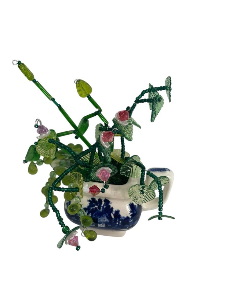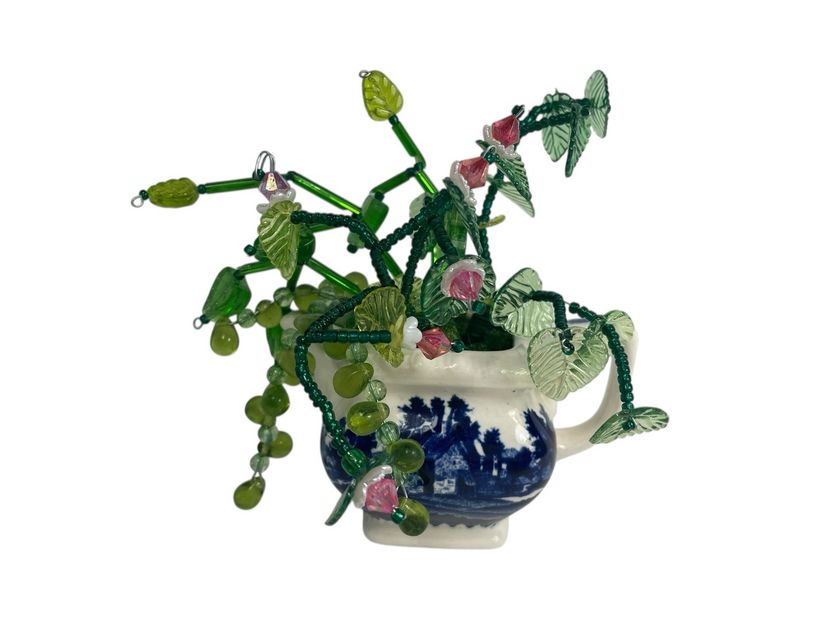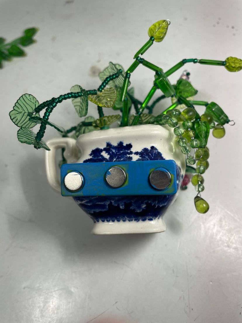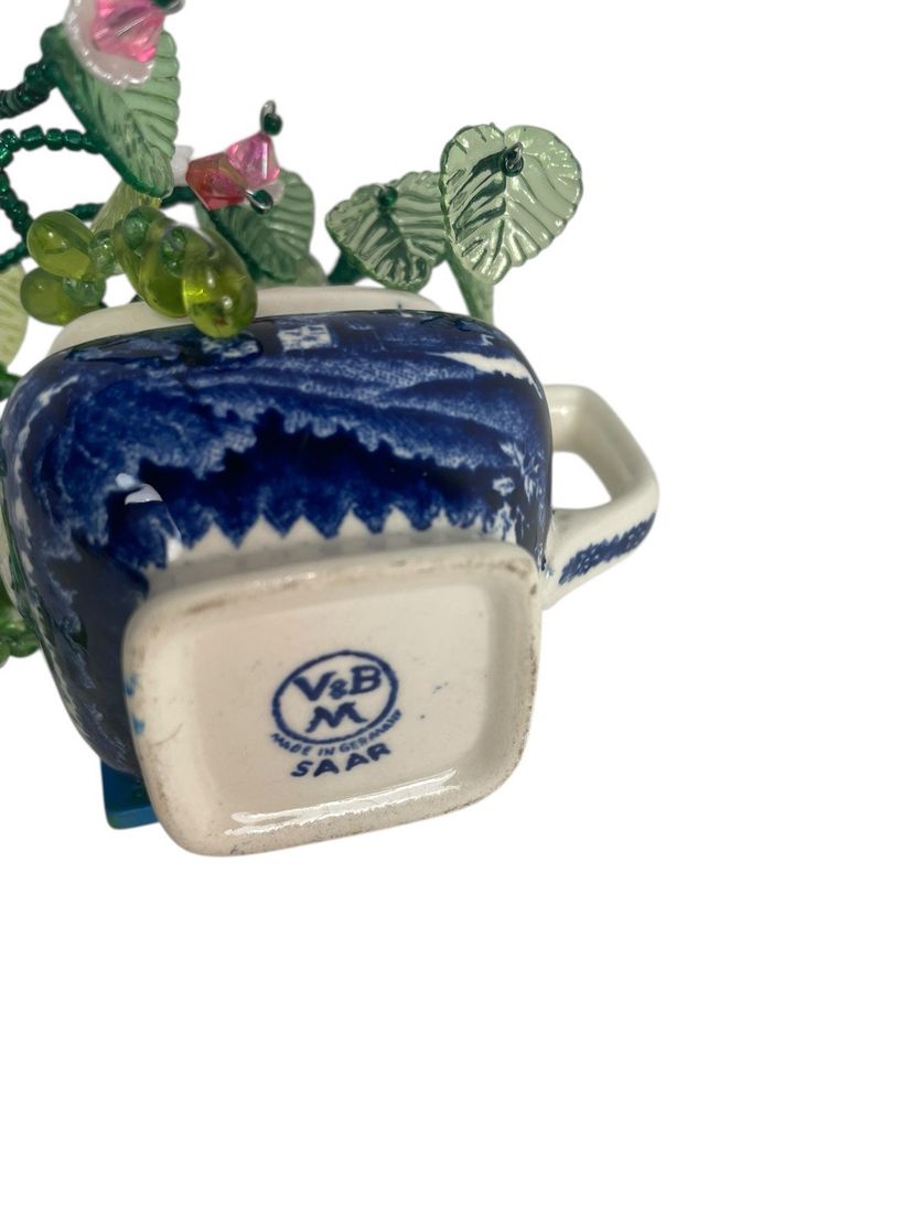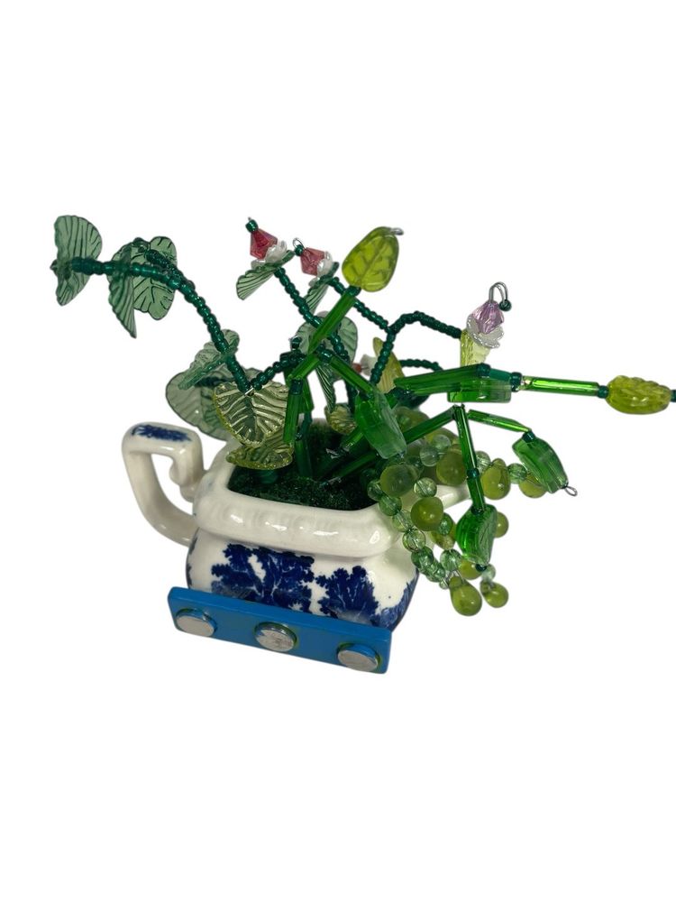 Vintage Mini creamer made by Villeroy Boch, c1945-1955. Height 3.5”, length 3”. Flowers, plants made with dead beads, acrylic leaves, beads. Heavy duty magnet. Mini creamer from my personal collection.