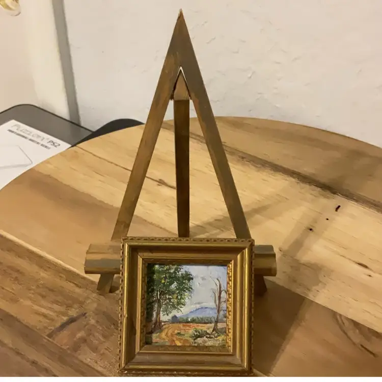 Oil paint on canvas with wood gold frame. A landscape with dirt path, trees, and hills in the background.