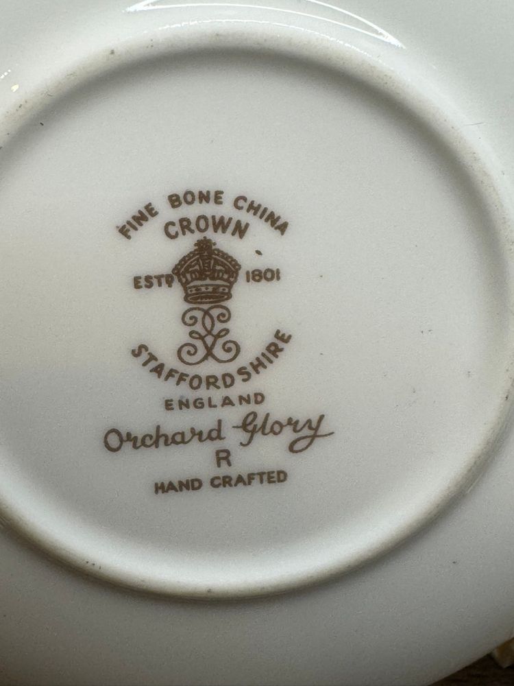 Marks/Dates: c. early 1980's. Stamped "Fine Bone China Crown Staffordshire England - Orchard Glory - Hand Crafted" on the bottom.