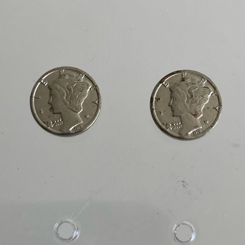 Vintage miniature Mercury dime earrings. They measure just 1/3” across. Posts with butterfly closure. There is wear to the silver on one edge as shown in photos. This exposes a smidge of the underneath copper. They are just something i have seen before.