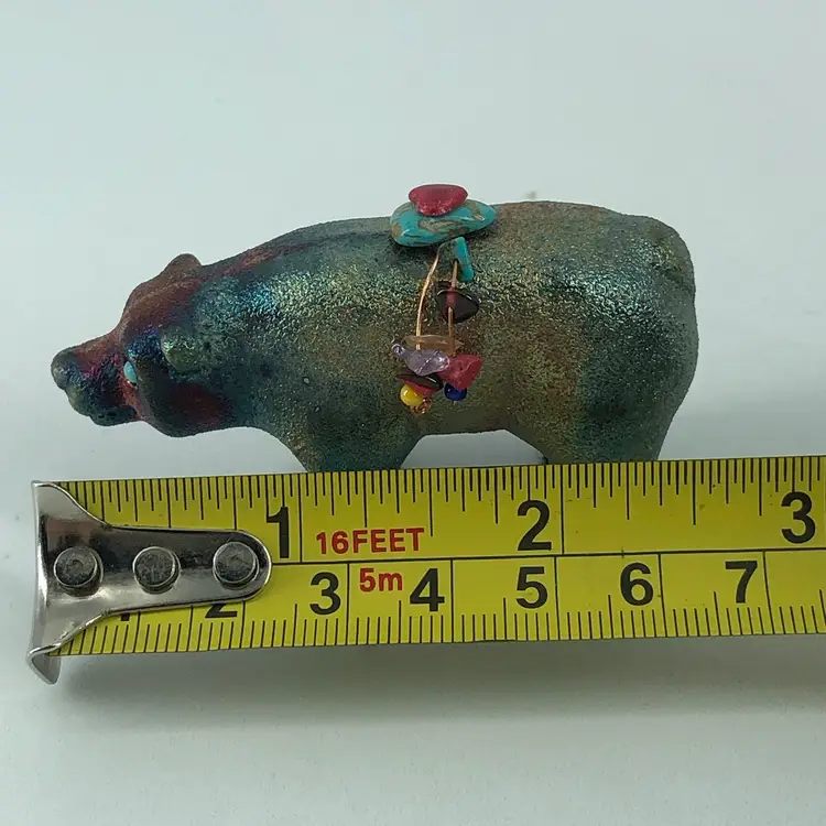 Absolutely stunning piece of pottery Has some turquoise and other stones on it Smaller in size Has felt pads on the bottom of the feet I love the beautiful colors of this piece