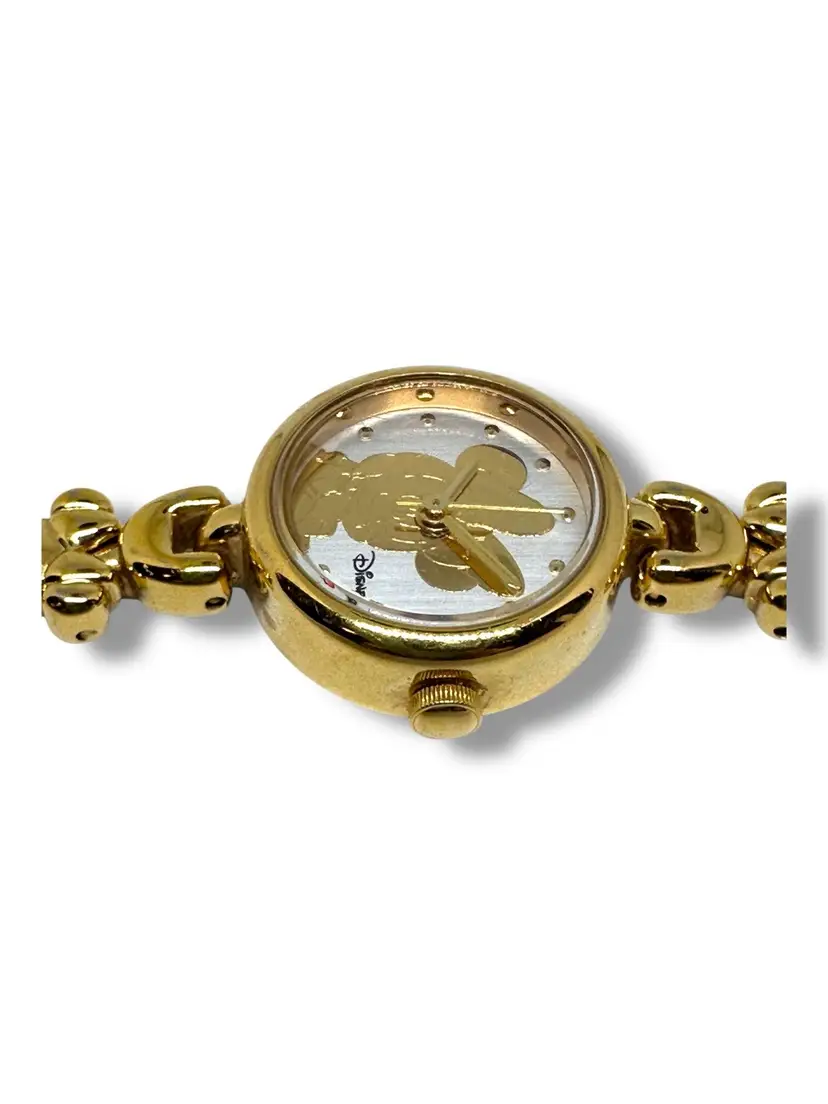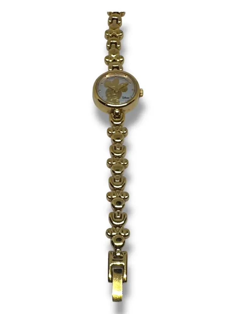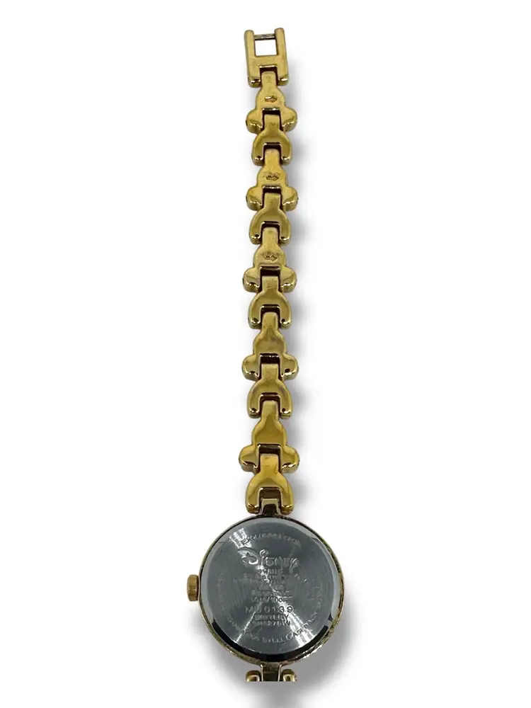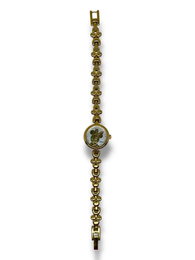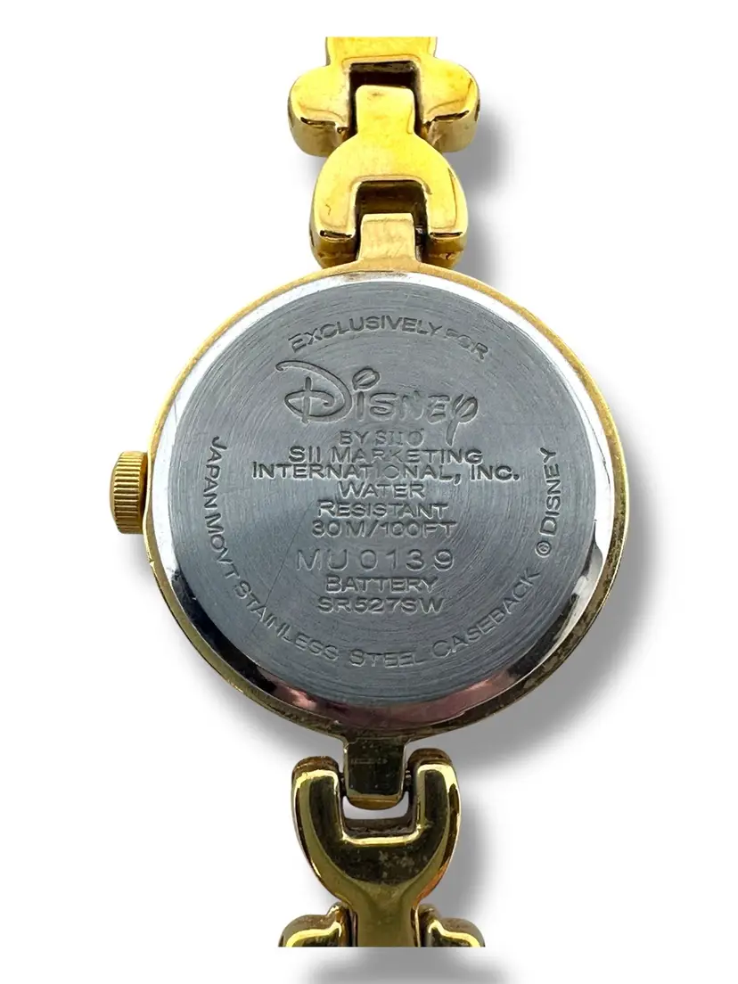 It measures 6 1/2 inches in length. This watch was personally owned by me. It has been well taken care of. It does work that needs a new battery. The rare Minnie Mouse SII by Seiko Disney Watch for Women is a nostalgic timepiece featuring a small gold-tone 20mm case size, perfect for any Disney fan. This 90s collectible watch showcases the iconic character of Minnie Mouse, making it a special addition to any Disneyana collection. Made in Japan by the renowned brand Seiko, this watch captures the essence of the beloved Disney franchise with its unique design and timeless appeal.
