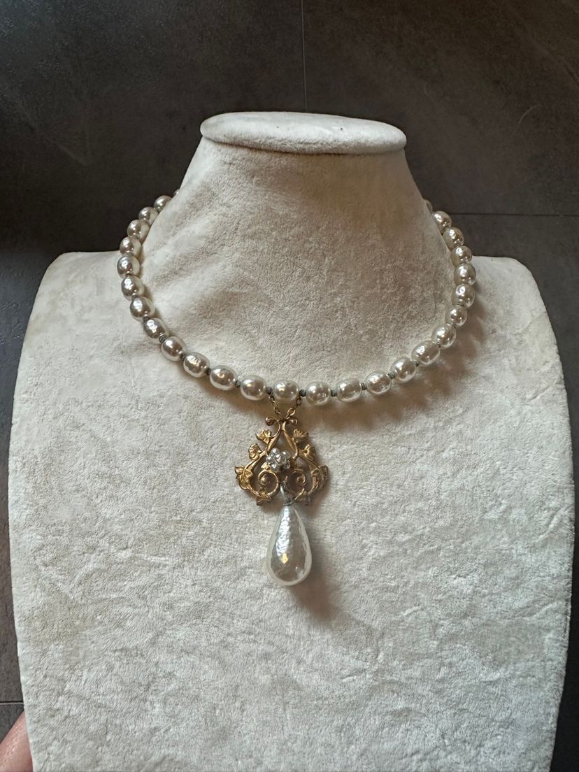 Stunning pearl choker by the acclaimed designer, Miriam Haskell. Definitely shows its age with vertigree present. Also missing center pearl of back clasp which is not significantly noticeable. Gorgeous box it was purchased in comes with. Priced considering all these factors.