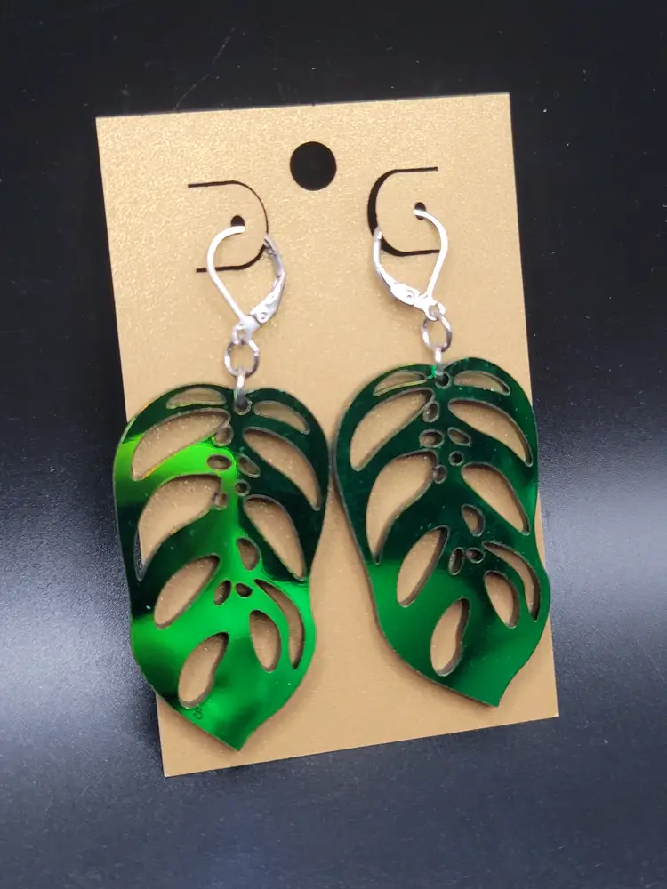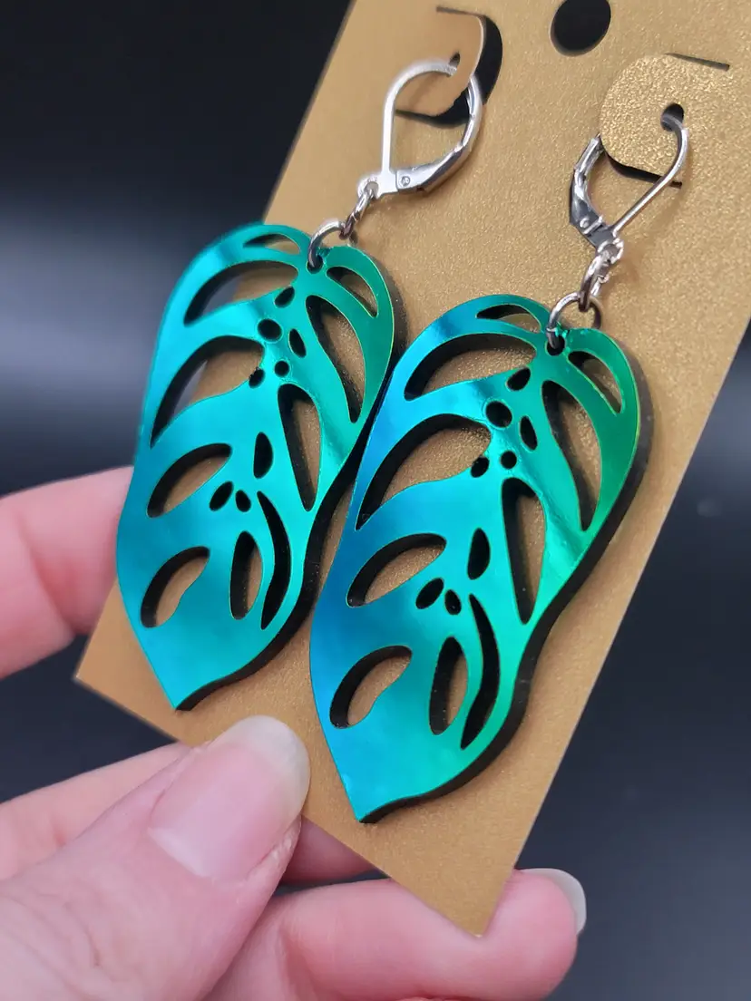 The acrylic for these earring have a shiny mirrored finish that typically present in shades of green, but will also sometimes shift to shades of blue.