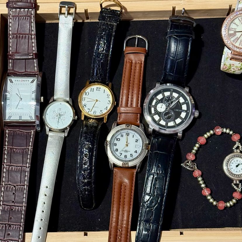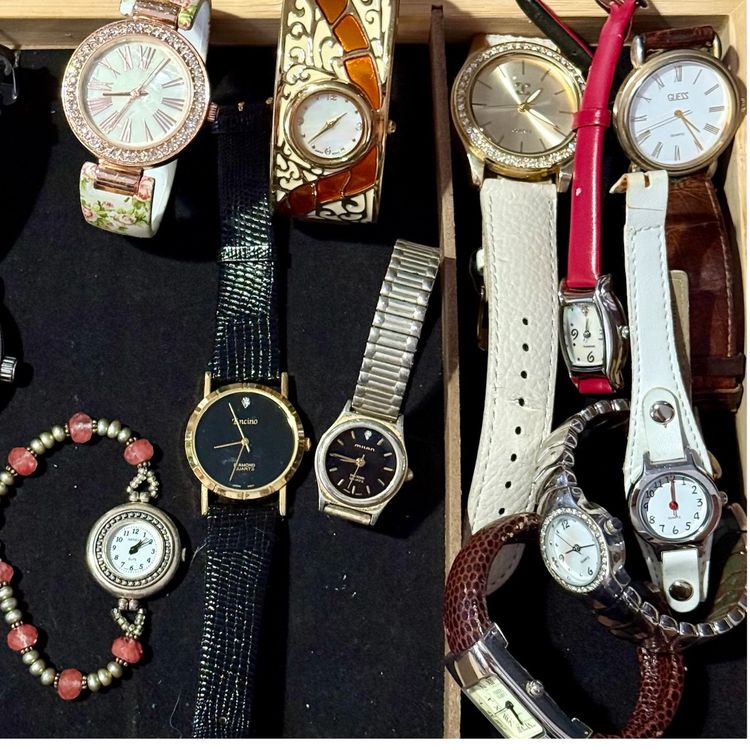 16 pieces: 10 wearable watches (4 men’s/6 women’s); 6 craft/repairable watches (need new bands, extensive cleaning, etc)