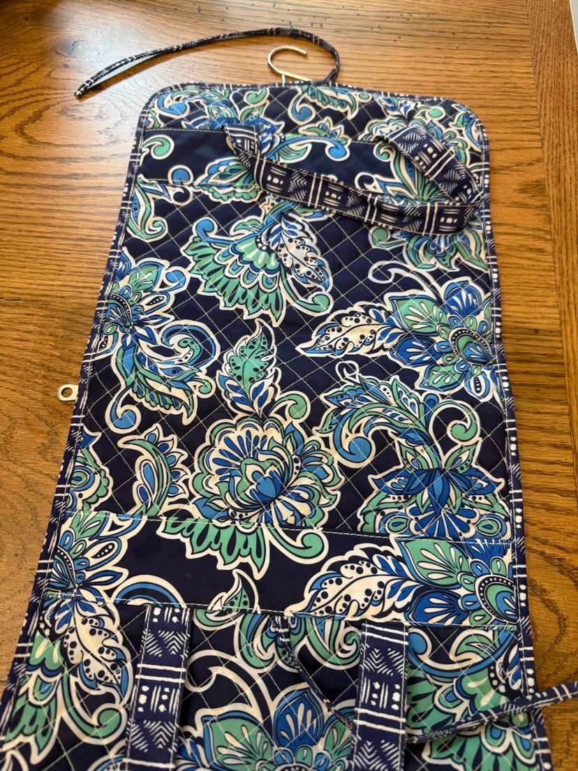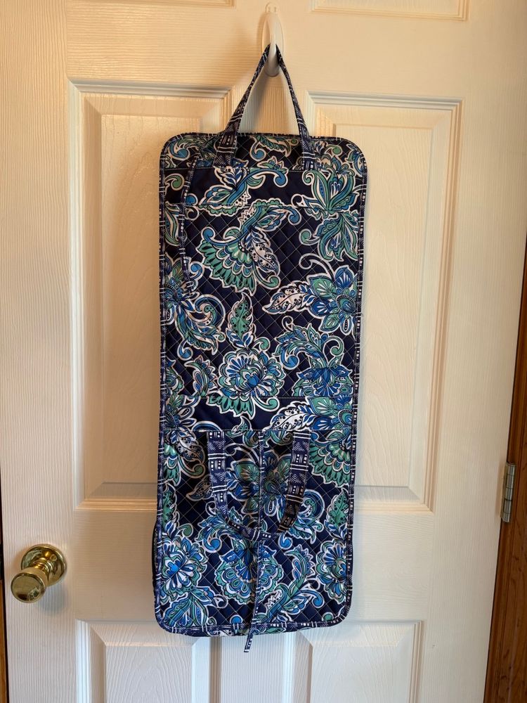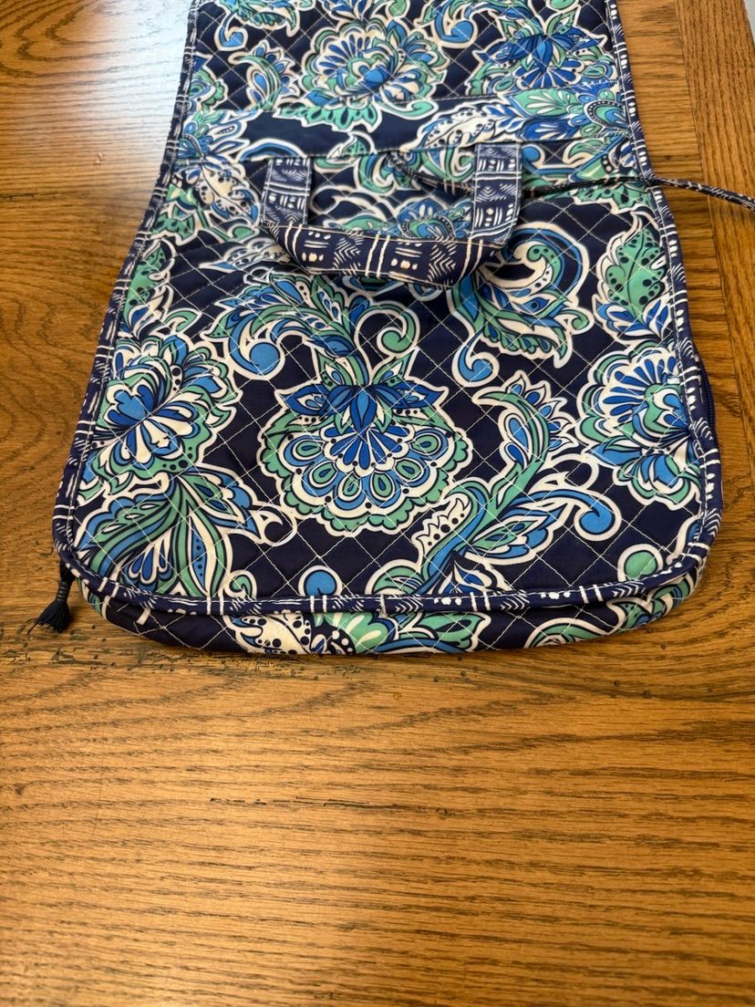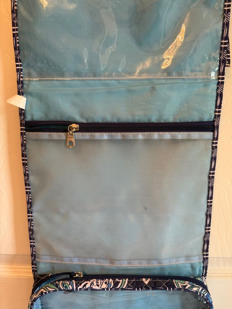 Elegant quilted tote with a soft blue hue. Perfect for everyday use and traveling. Bag opened is 28" X 11" three compartments all three zipper shut With a handle to carry with and ties to tie to keep Italian together. Great condition no tears or stains.