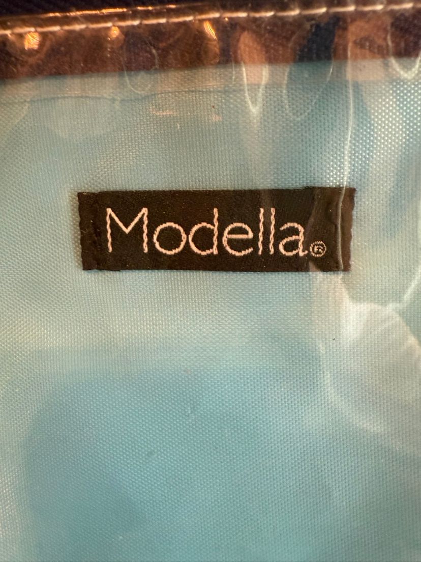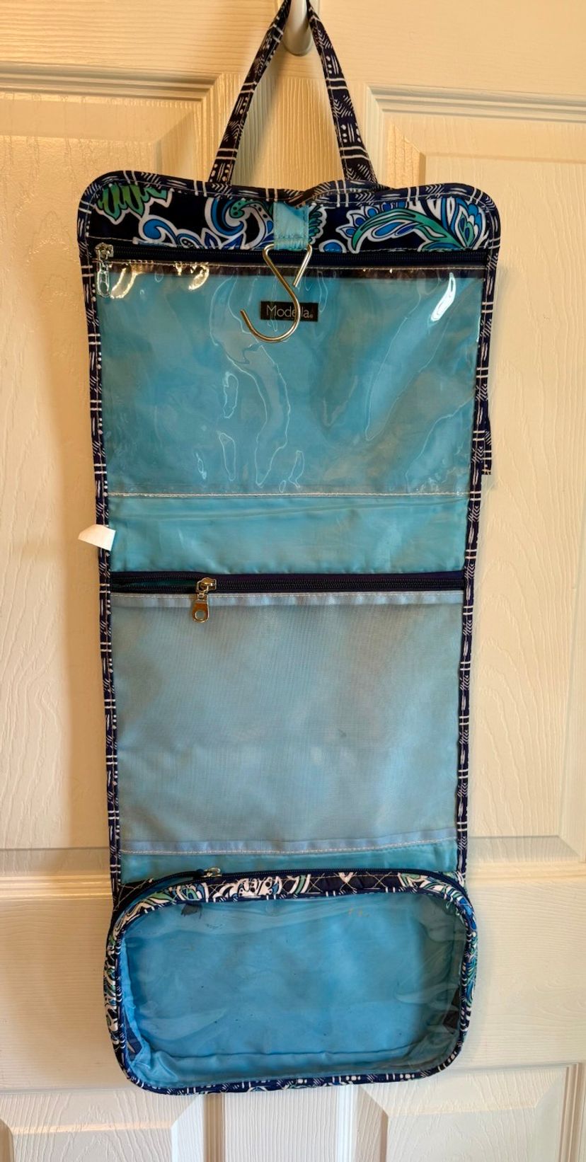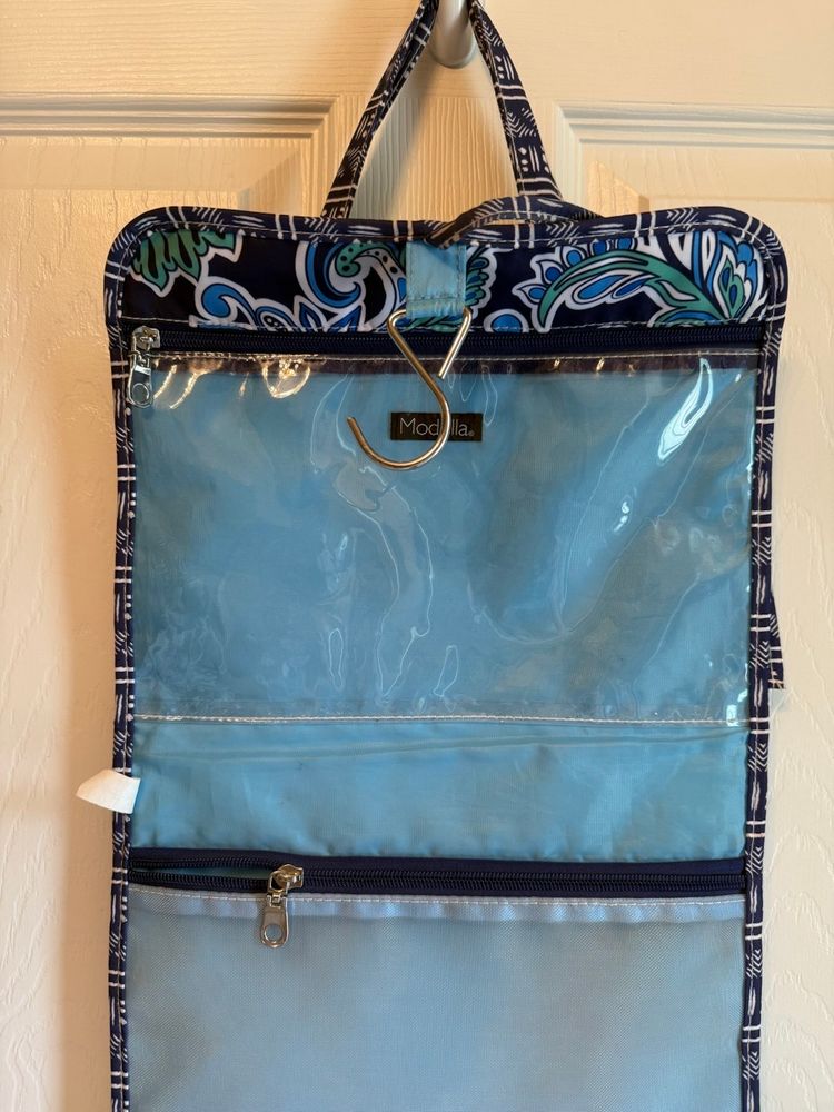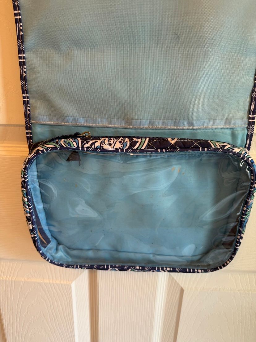 Elegant quilted tote with a soft blue hue. Perfect for everyday use and traveling. Bag opened is 28" X 11" three compartments all three zipper shut With a handle to carry with and ties to tie to keep Italian together. Great condition no tears or stains.