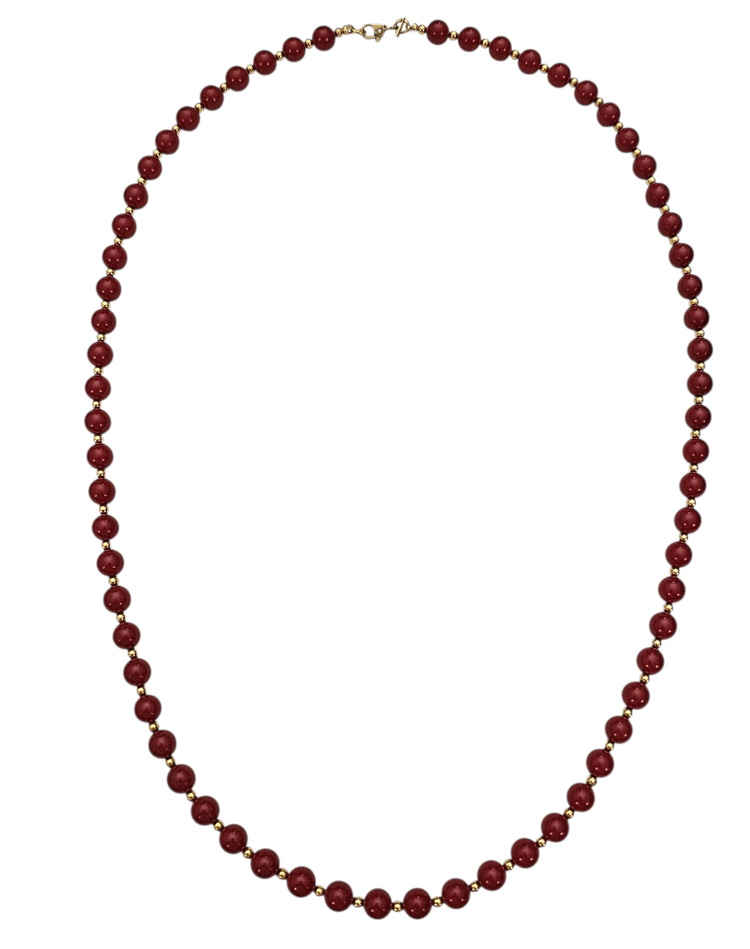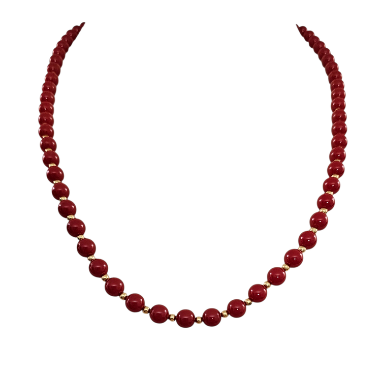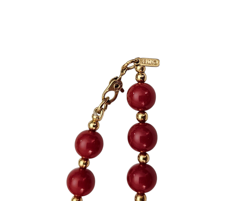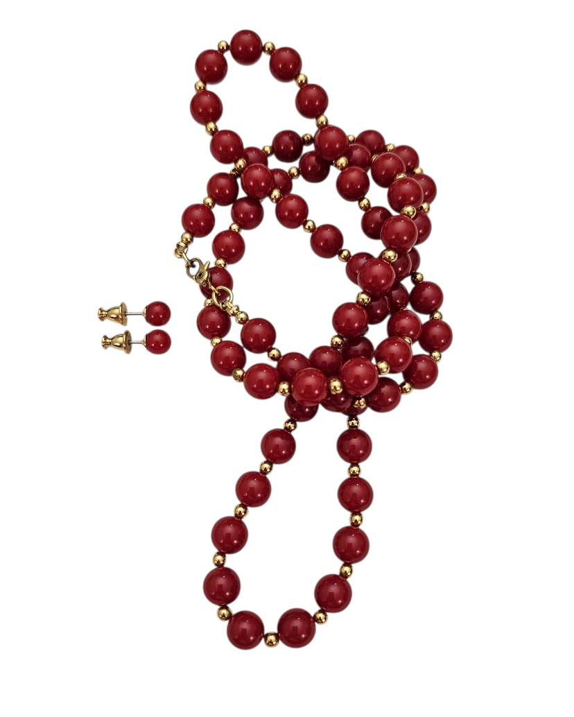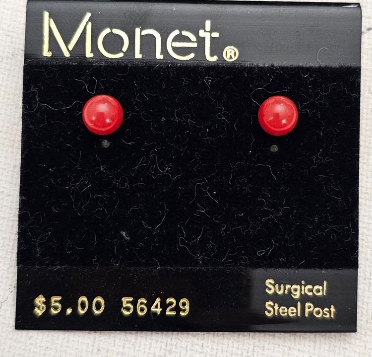 • Monet Red Bead Necklace And Ball Post Earrings Set • Vintage Monet costume jewelry • Red Lucite beads • Radiant gold-tone metal setting • The necklace bead measures approximately 7.8 mm in size • The post earring ball beads measure approximately 5.9 mm in size • The bead necklace measures 28 inches in total length • The necklace has a rectangular-shaped metal tag marked ©MONET • The ends of the necklace are fastened with a Sister clasp closure • This clasp consists of two hooks that interlock, creating a strong and secure connection that is difficult to open accidentally • The posts are securely fastened with pushbacks that slide onto a straight earring post that holds your earring in place • These earrings and necklace set can be worn as an everyday piece • The earrings come with their original cardboard backing • Good condition • C327