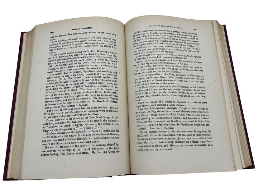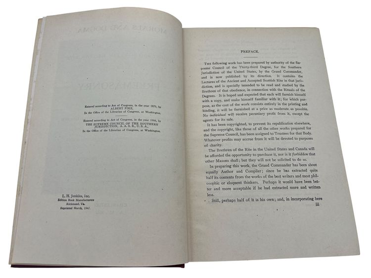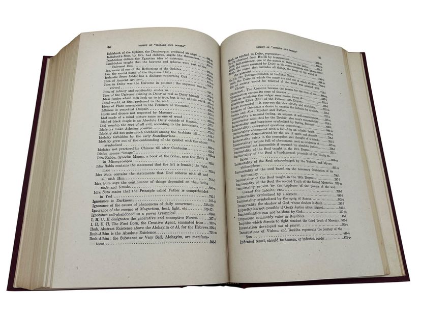 Classic mid-century reprint of Albert Pike’s landmark Masonic text, prepared for the Supreme Council, 33°, Southern Jurisdiction. Charleston title page with Pike portrait frontispiece. Red cloth boards with gilt double-headed eagle device; bound index/digest section present. Approx. 9.25" × 6". Solid reference copy for Scottish Rite and Freemasonry collectors.