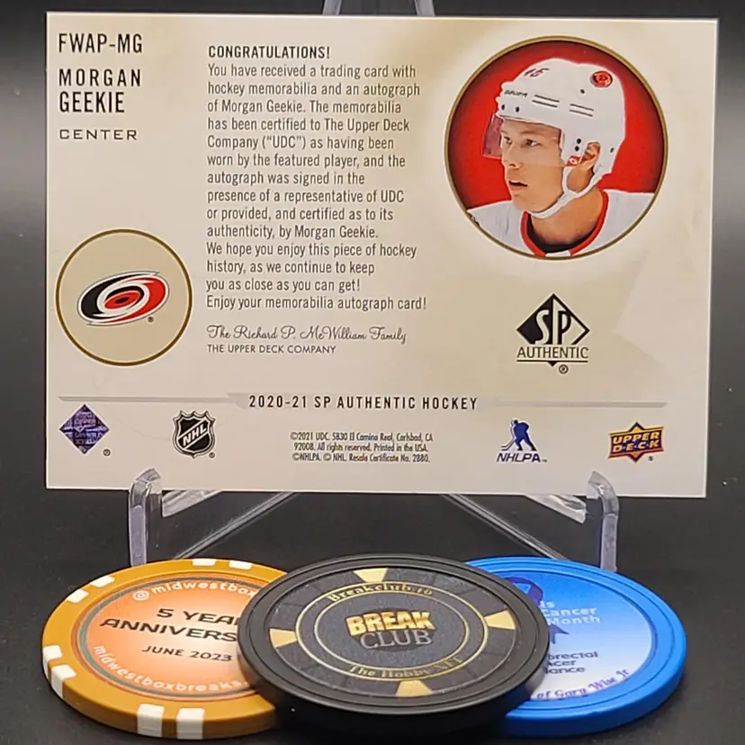 Morgan Geekie FWPA 2020-21 Upper Deck SP Authentic Hockey Future Watch Limited Auto Material Insert Numbered 31/100 Card #FWAP-MG - Carolina Hurricanes