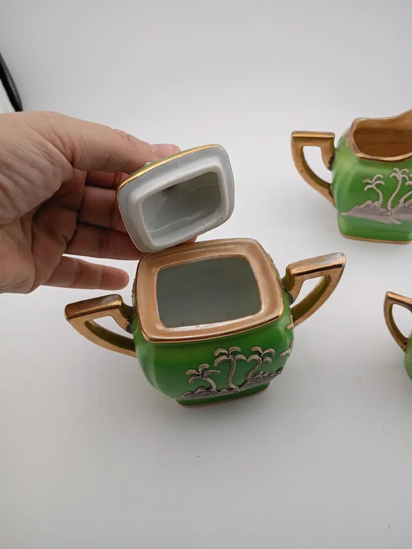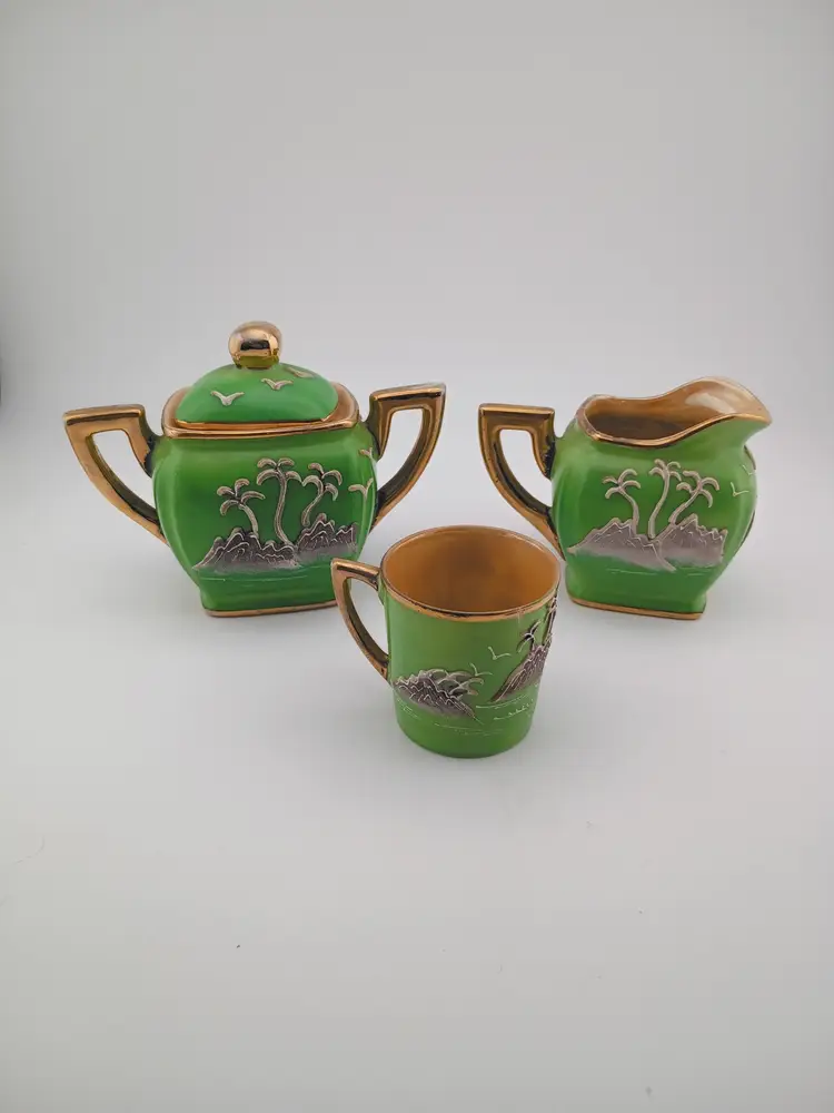 This is a gorgeous little set of green dragonware -- a creamer, lidded sugar bowl, and demitasse cup. It's moriage from Japan and in excellent condition with no chips or cracks.