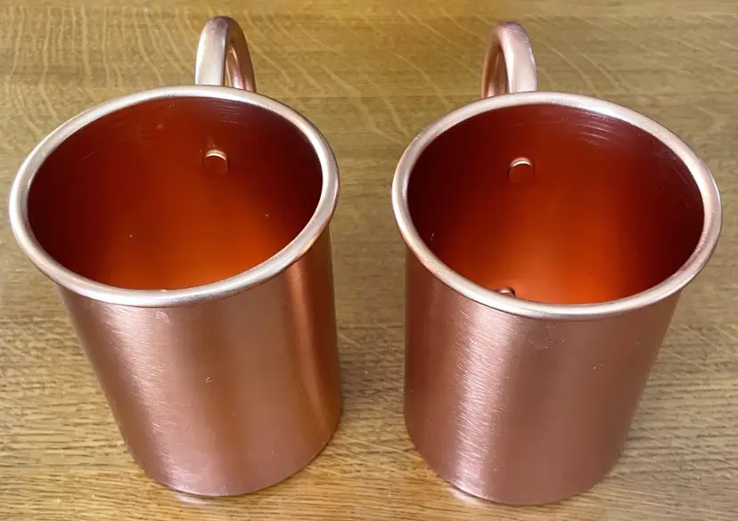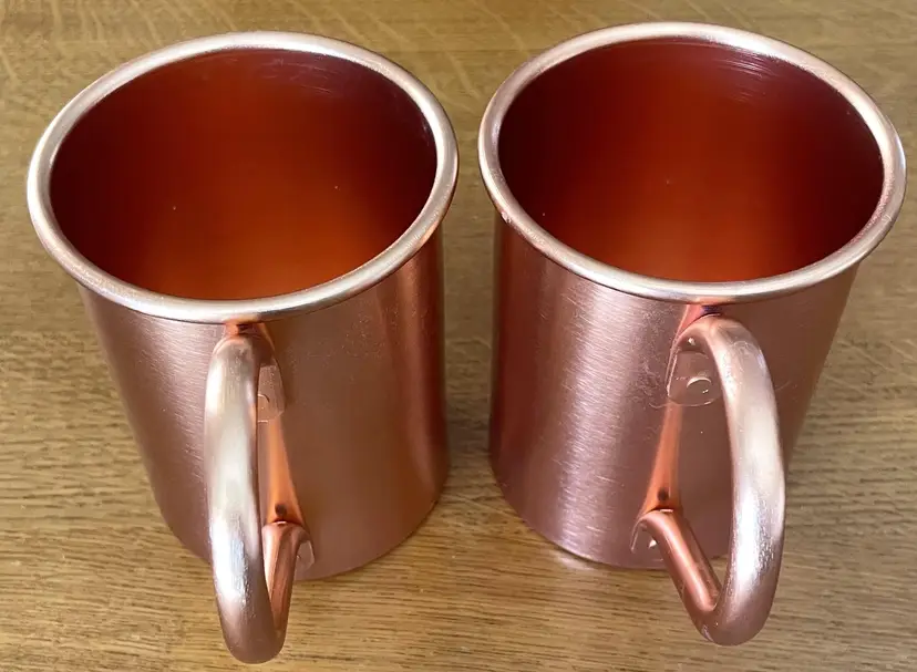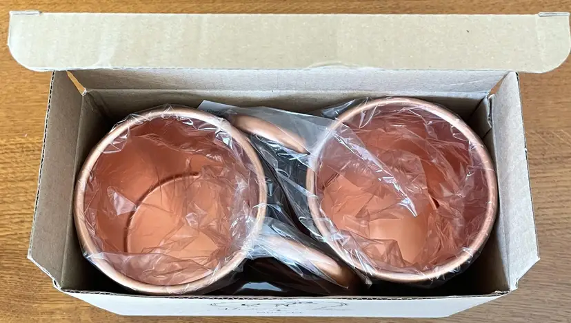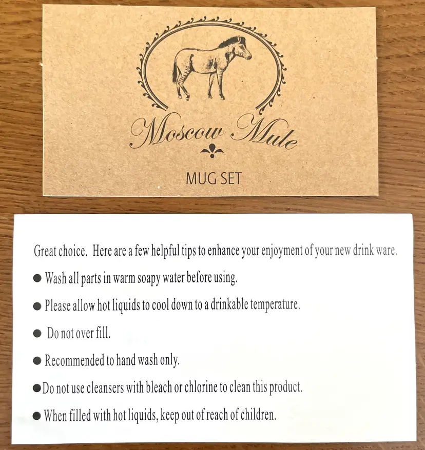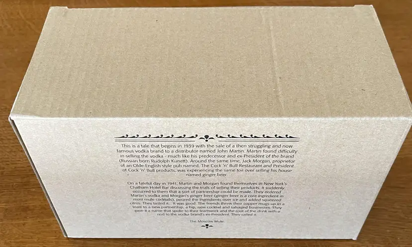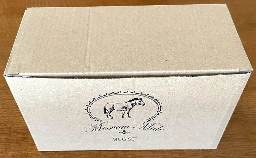 This is a set of two Moscow Mule mugs in a box. They are designed for serving Moscow Mule cocktails. The set includes two mugs and they are made in China. The mugs are perfect for enjoying drinks at home and would make a great addition to any kitchen or bar collection.
